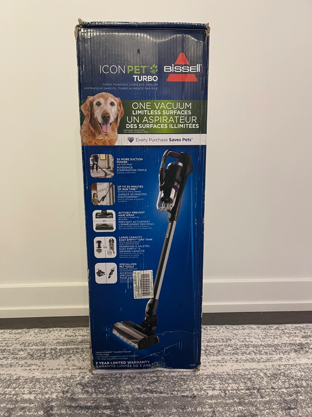 Selling a Bissell ICONPET Turbo cordless vacuum! It's designed to be turbo powered for pet hair and is cordless for easy use. Key features include: - A 25V lithium-ion battery - Lighted motorized brush roll - LED lighted crevice tool - Up to 50 minutes of run time Price is negotiable