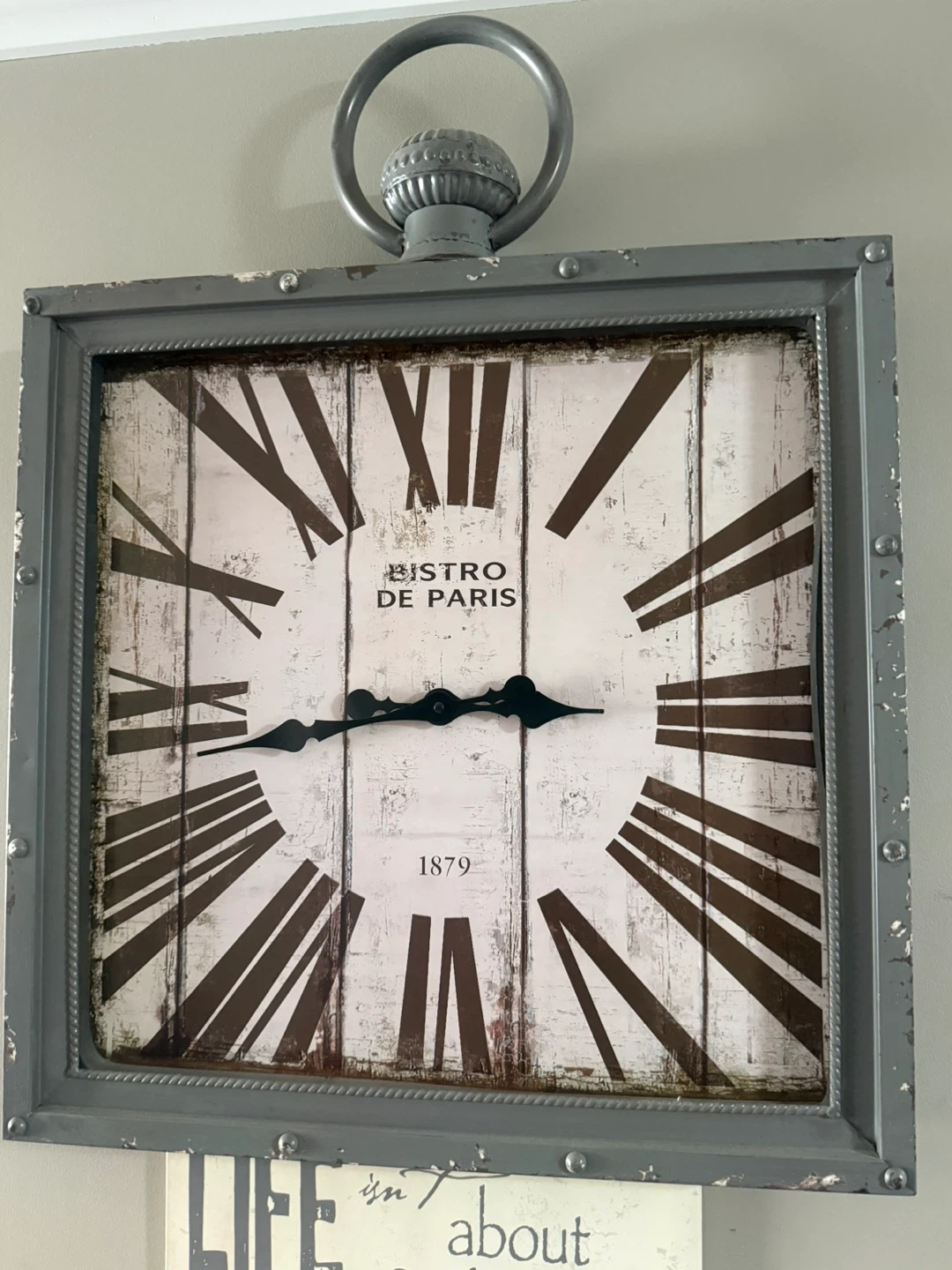 80Selling a charming Bistro de Paris square wall clock! Can also stand alone not in the wall. It has a rustic, vintage-inspired design with Roman numerals and a distressed finish. It would be a great addition to any kitchen or living room