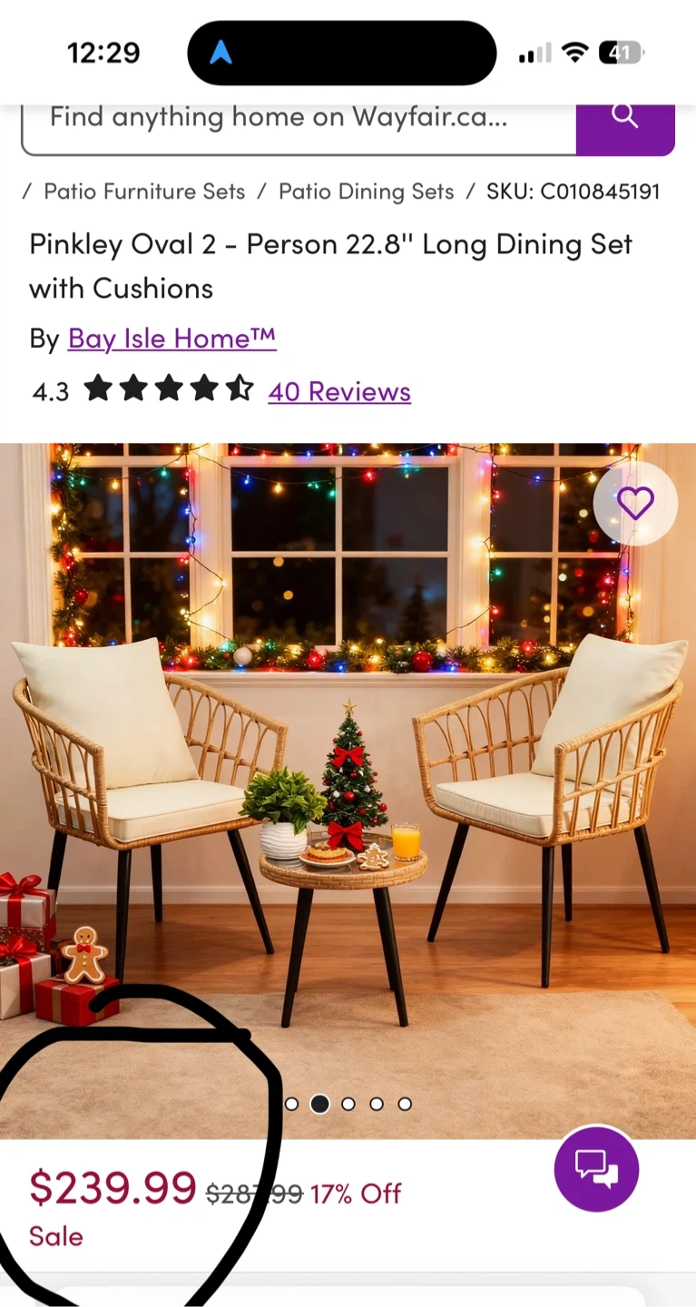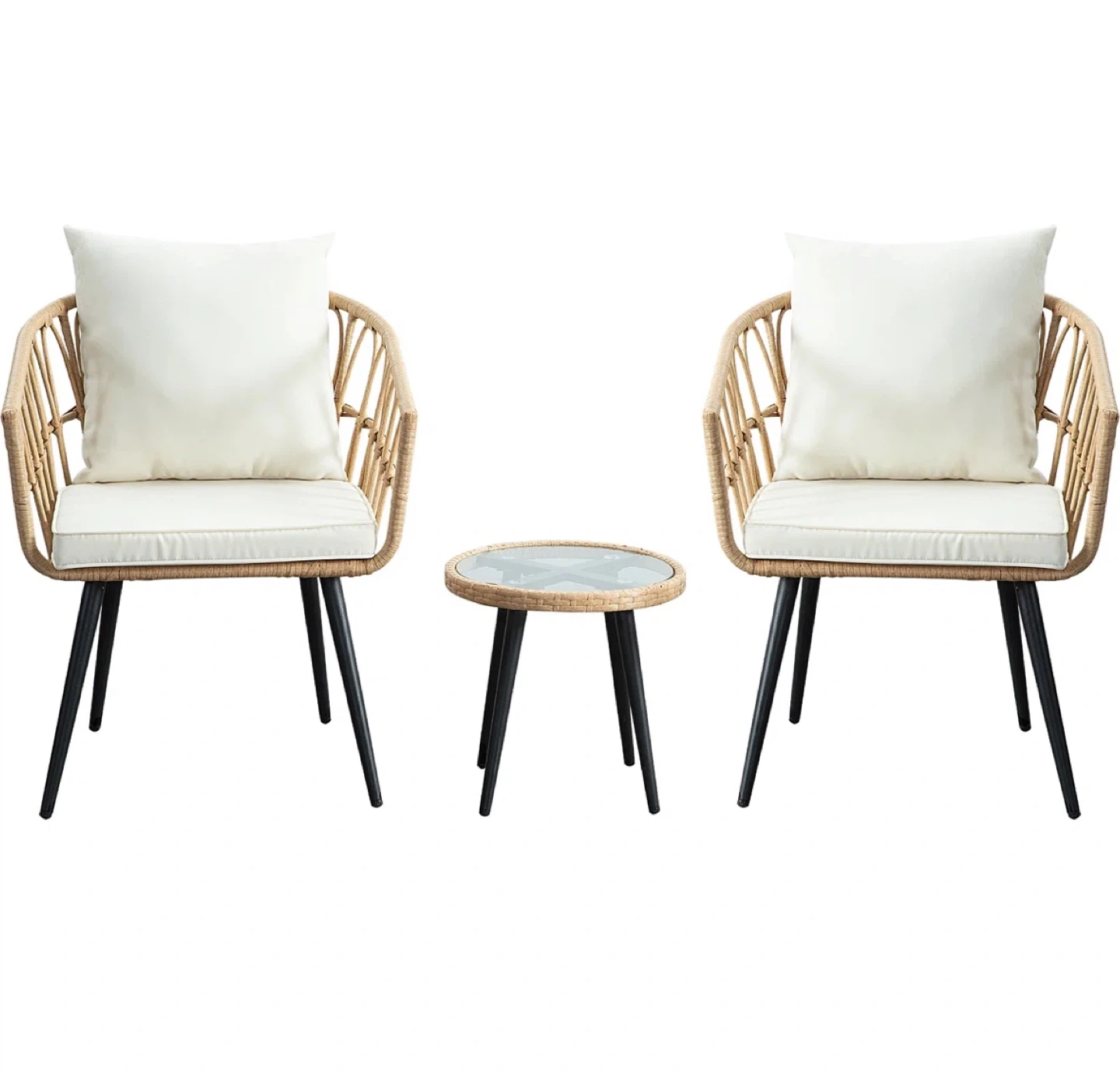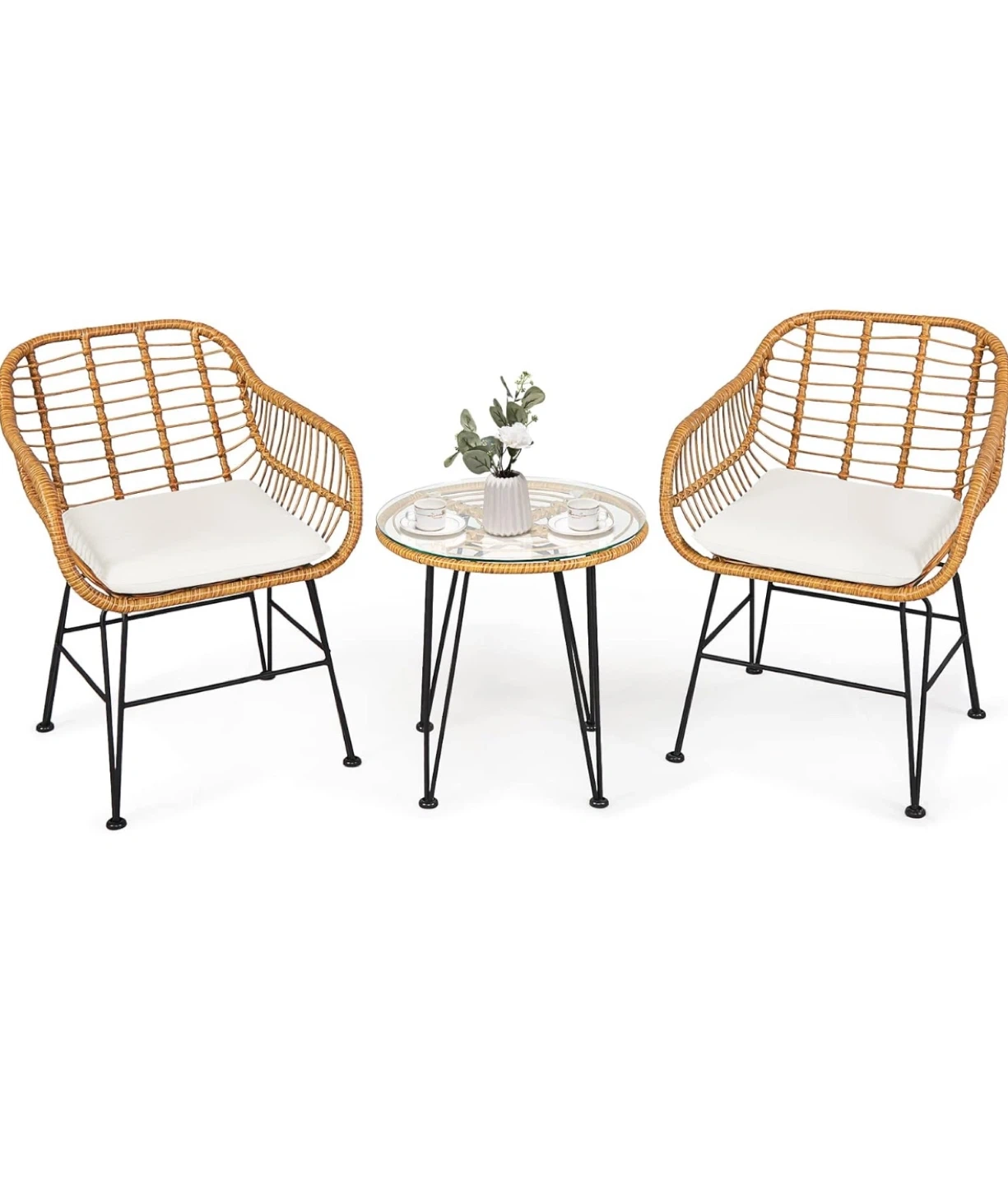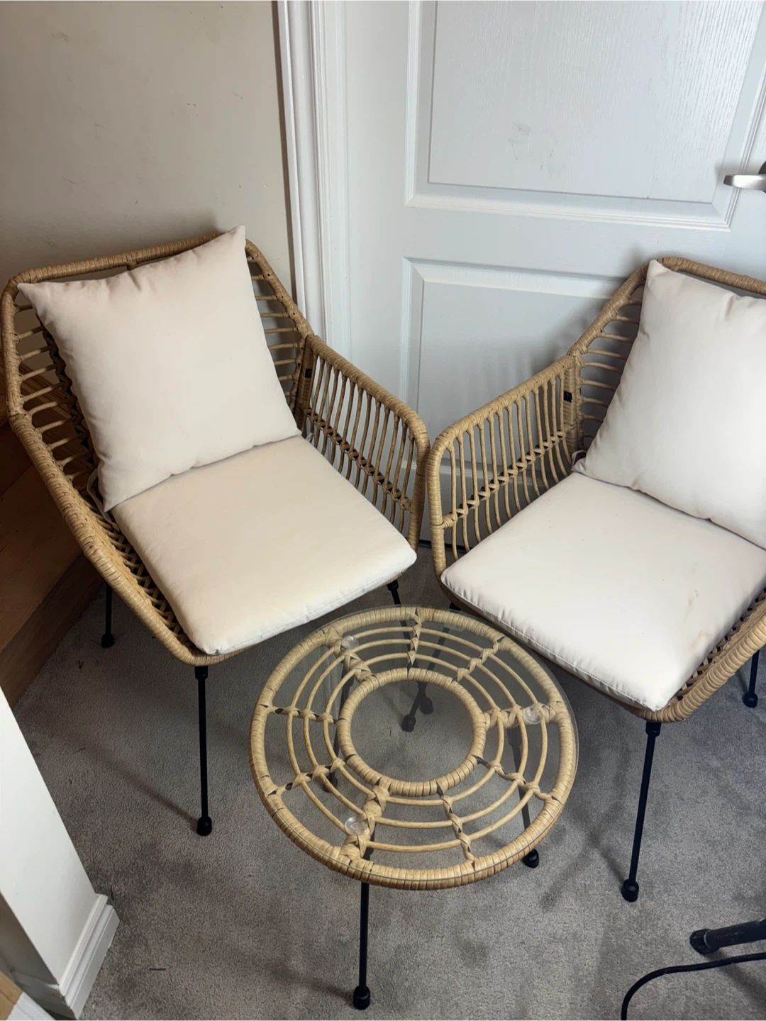 218Selling a cute Bay Isle Home Pinkley Oval 2-Person patio set! It includes two chairs with cushions and a small round table with a glass top. It iand would be perfect for a small space