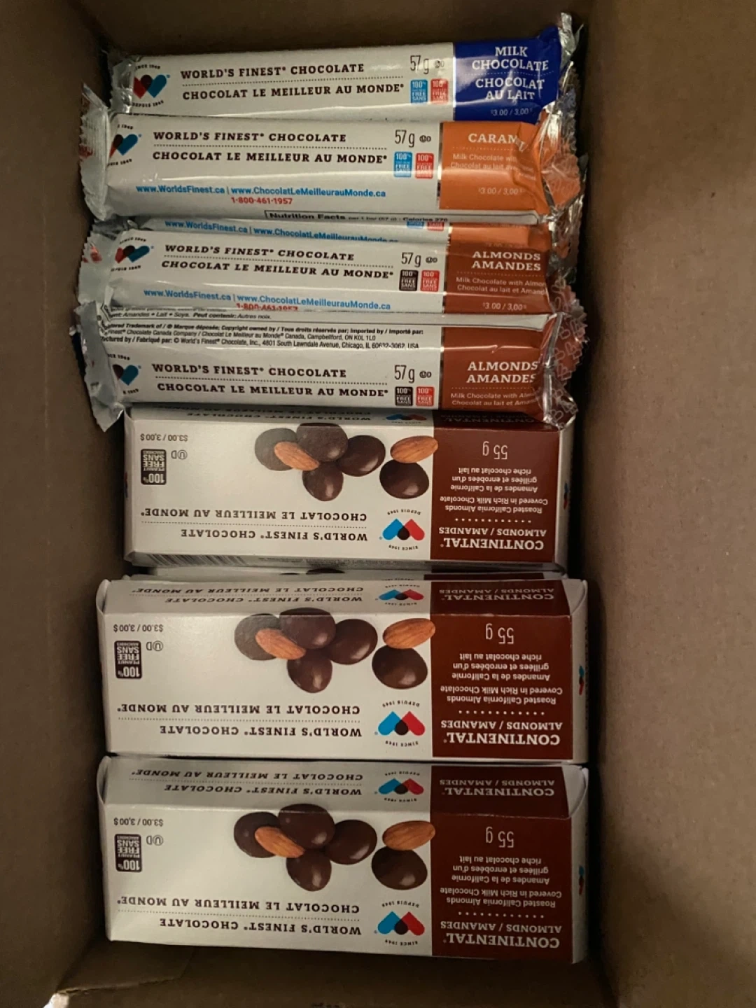 Indulge in World's Finest Continental Almonds chocolate bars, each 55-57g of roasted California almonds covered in rich milk chocolate. These chocolate bars are used and ready to be enjoyed.