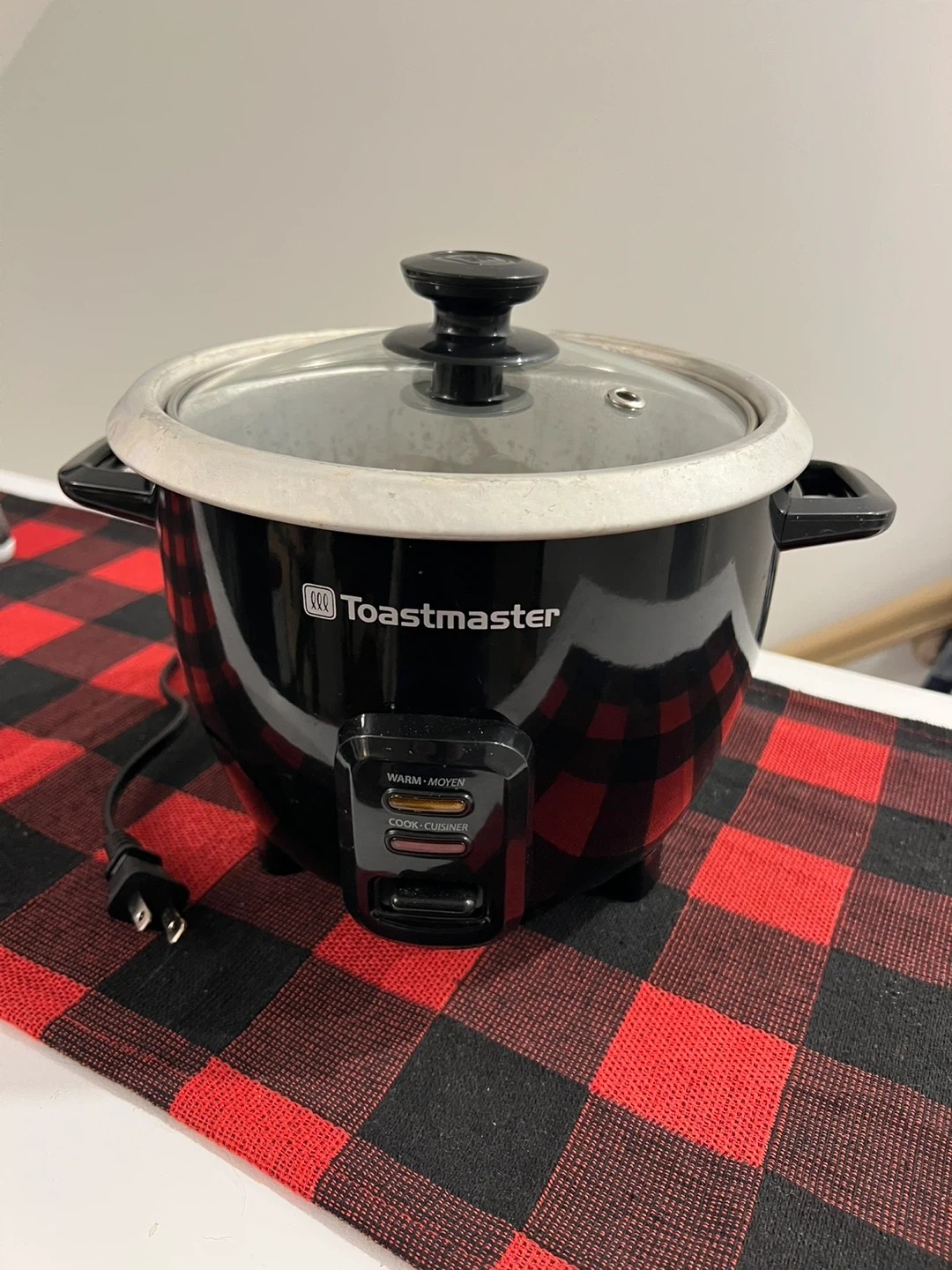 This is a Toastmaster electric rice cooker. It has a non-stick inner pot and comes with a glass lid. Simple operation with cook and warm settings.