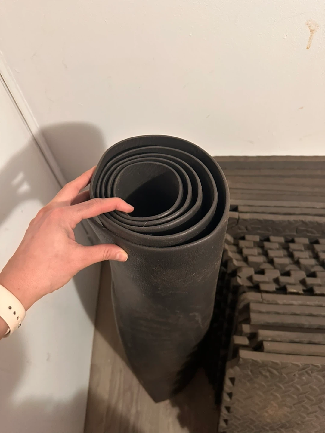 This is a dark grey rubber floor mat, rolled up for storage. It's a durable mat suitable for under various heavy gym equipment. It provides a protective layer for floors.