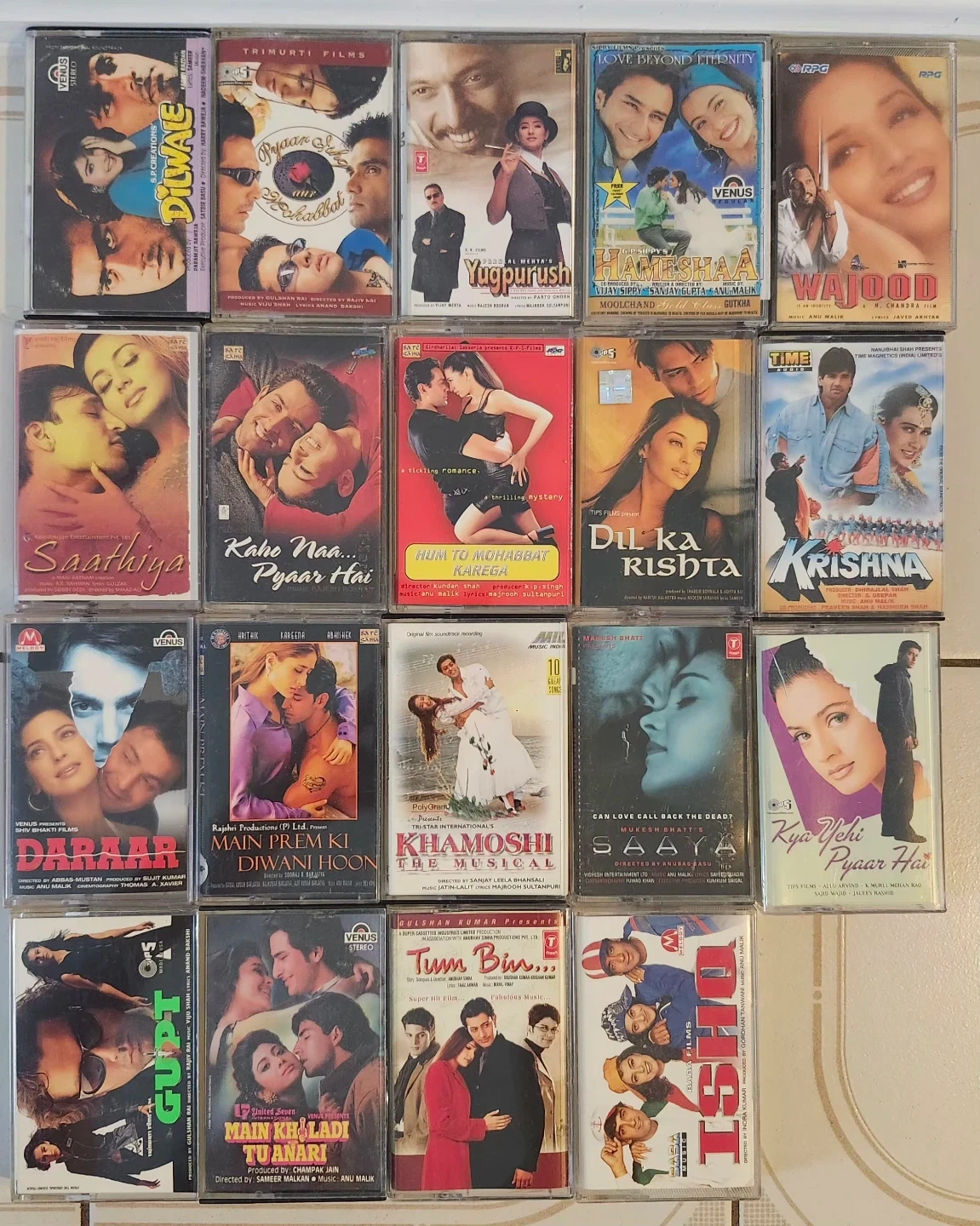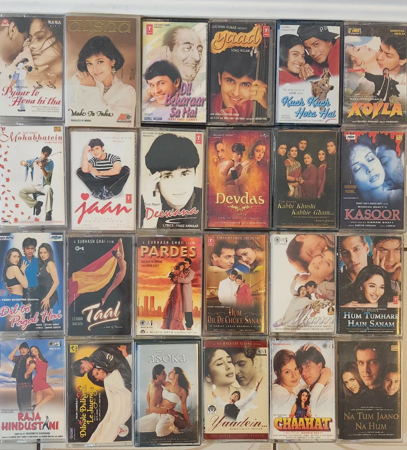 Collection of various Bollywood movie cassette tapes. Titles include Raja Hindustani, Kuch Kuch Hota Hai, and more. These are vintage music and film collectibles. $15 each