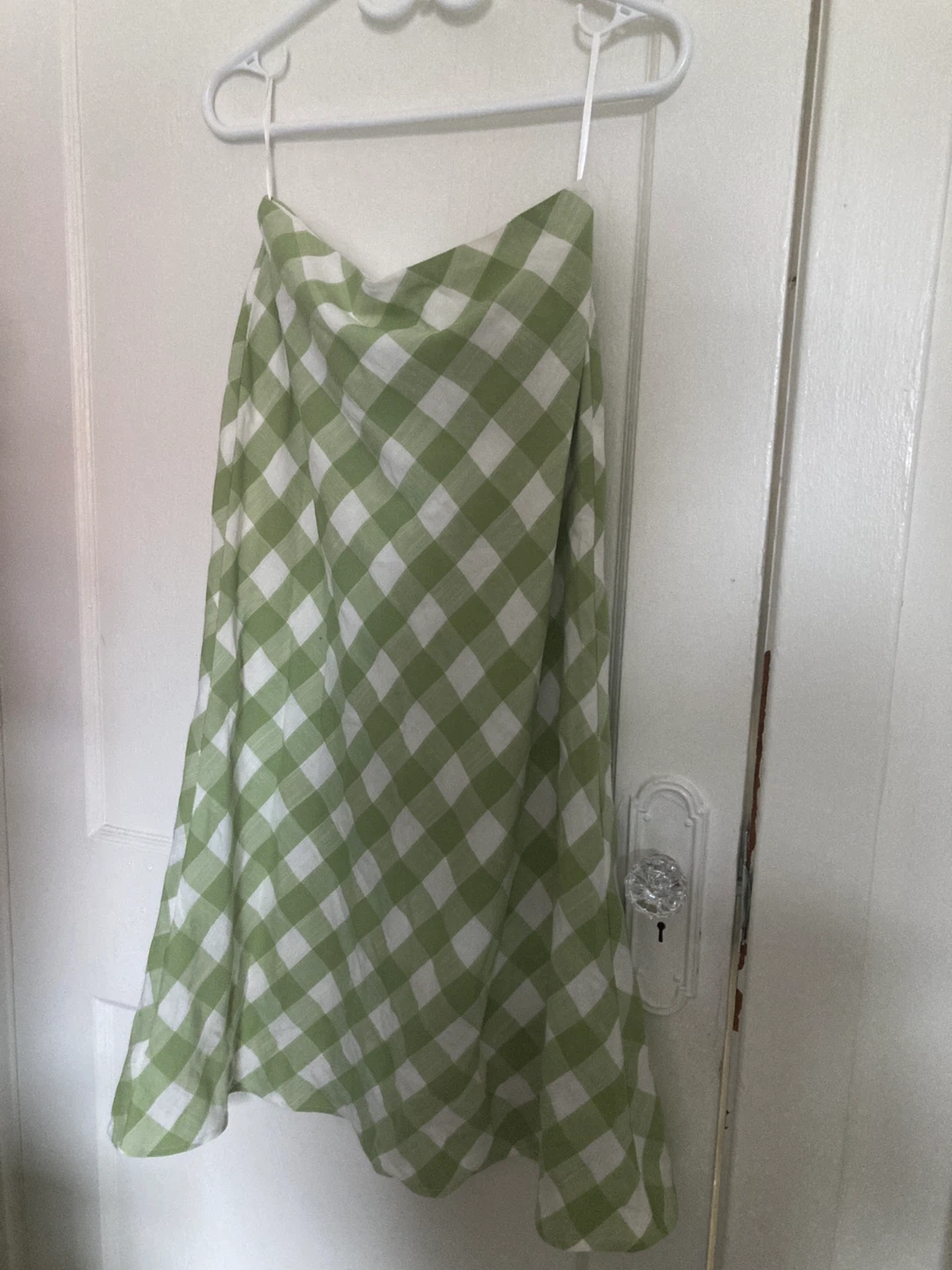A flowy midi skirt with a green and white gingham pattern. It's lightweight and has a casual silhouette. This skirt is perfect for warmer weather outings! Has tags on so never worn.