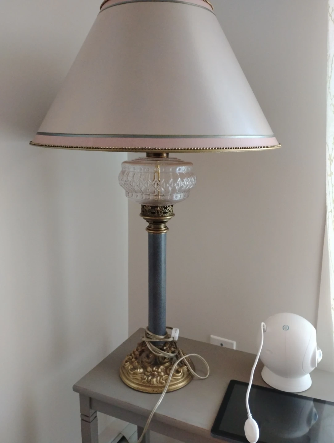 This table lamp features a decorative ornate base and a grey column. It has a frosted shade with pink and blue trim. The glass accent piece above the base adds a touch of elegance. It's a stylish addition to any room!