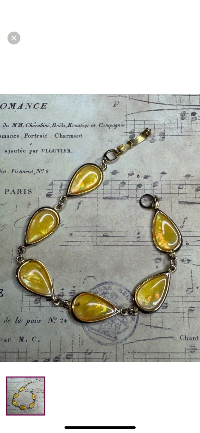 Gold tone metal bracelet. Features five teardrop shaped stones. Clasp closure. Looks like resin or glass.
