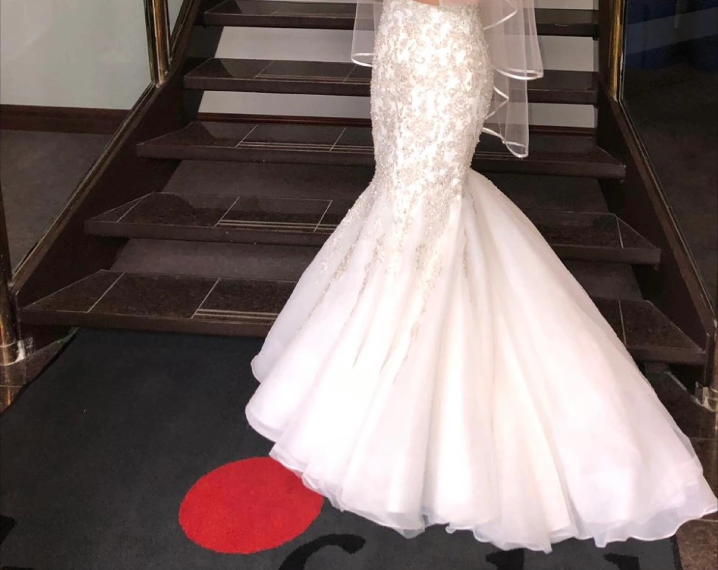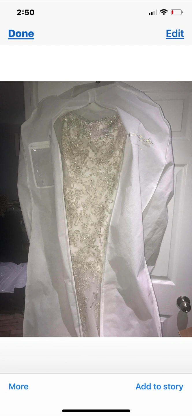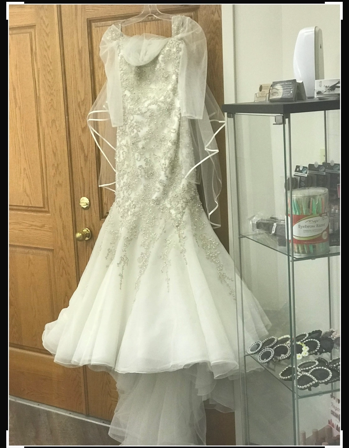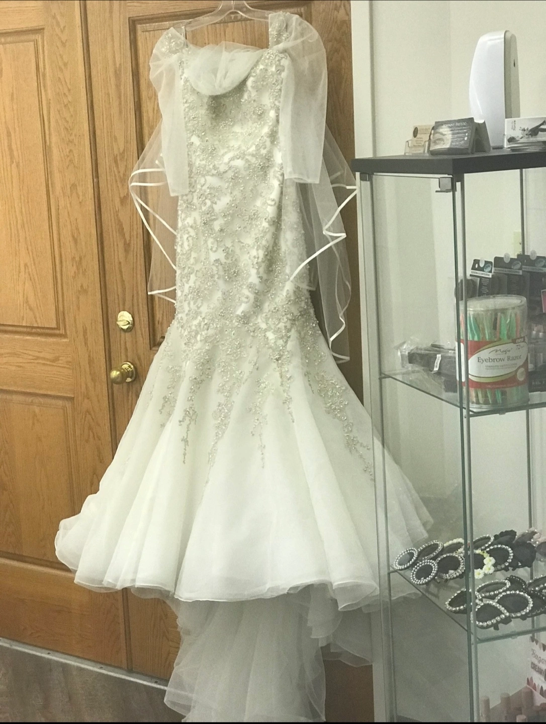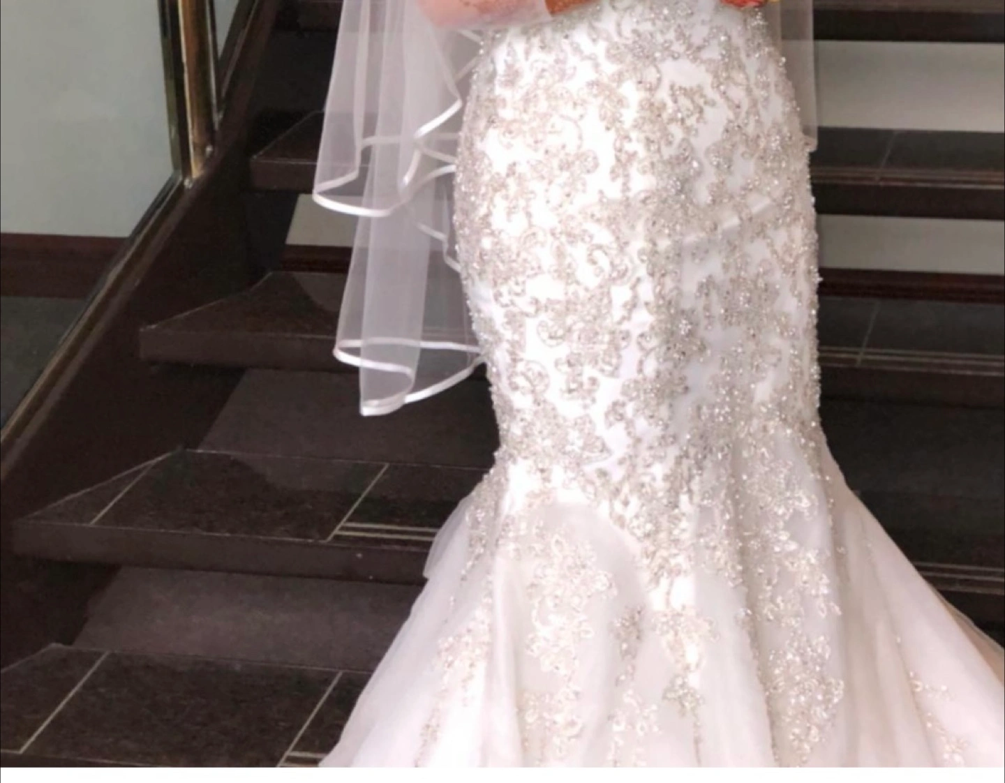 This gorgeous wedding dress is the perfect choice to feel like a princess on your big day. The dress is white and has intricate beadwork. Features a long train and sheer sleeves, along with a matching veil.paid $5000. With the vial too .