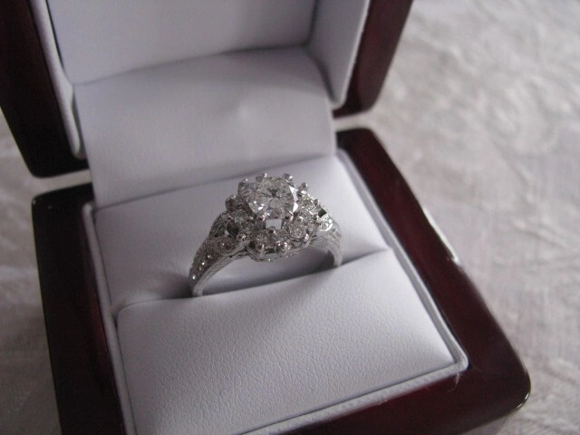Beautiful 14k white gold engagement ring featuring a round moissanite center stone with diamond accents. Ring size is 8.75 and it is sizable. The main stone is approximately 7.5 mm in width and length. Gemstone clarity is loupe clean with an excellent cut grade. Total carat weight is 1.67. This handmade ring is perfect for engagements, weddings, anniversaries, or as a gift. The moissanite offers superior brilliance (RI 2.65) compared to mined diamonds. Made in the USA.
