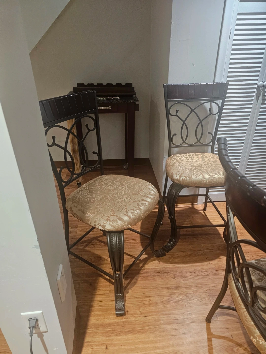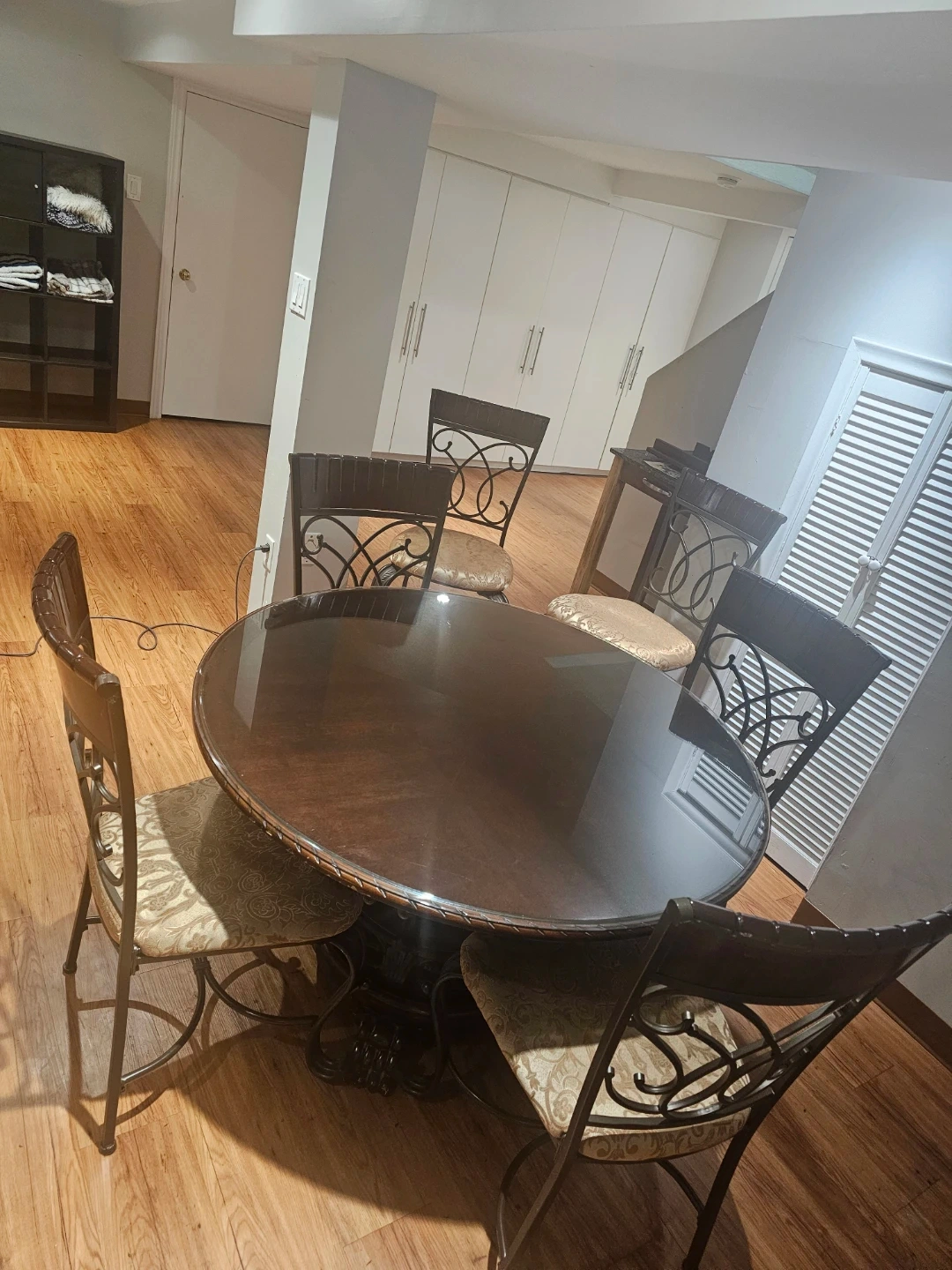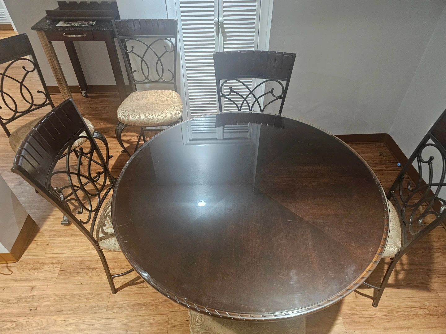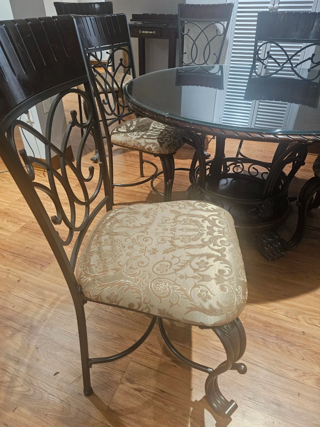 A dark wood round dining table with a glass top, complemented by four decorative metal chairs with upholstered seats as well as 2 tall chair for counter. The chairs feature ornate scrollwork on the metal backs and are fitted with patterned, padded cushions. This set offers a stylish seating arrangement for your dining area.