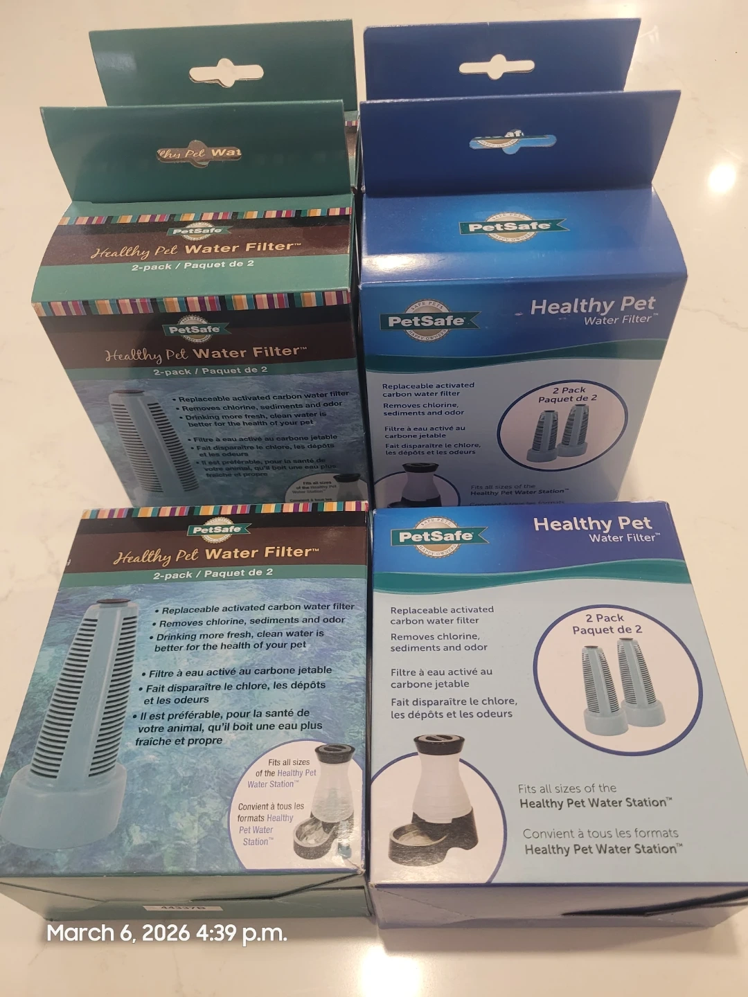 These are PetSafe Healthy Pet Water Filters, with two 2-packs included. They're replaceable activated carbon filters that remove chlorine, sediments, and odor. This helps provide fresher, cleaner water for your pet. Fits all sizes of the Healthy Pet Water Station.