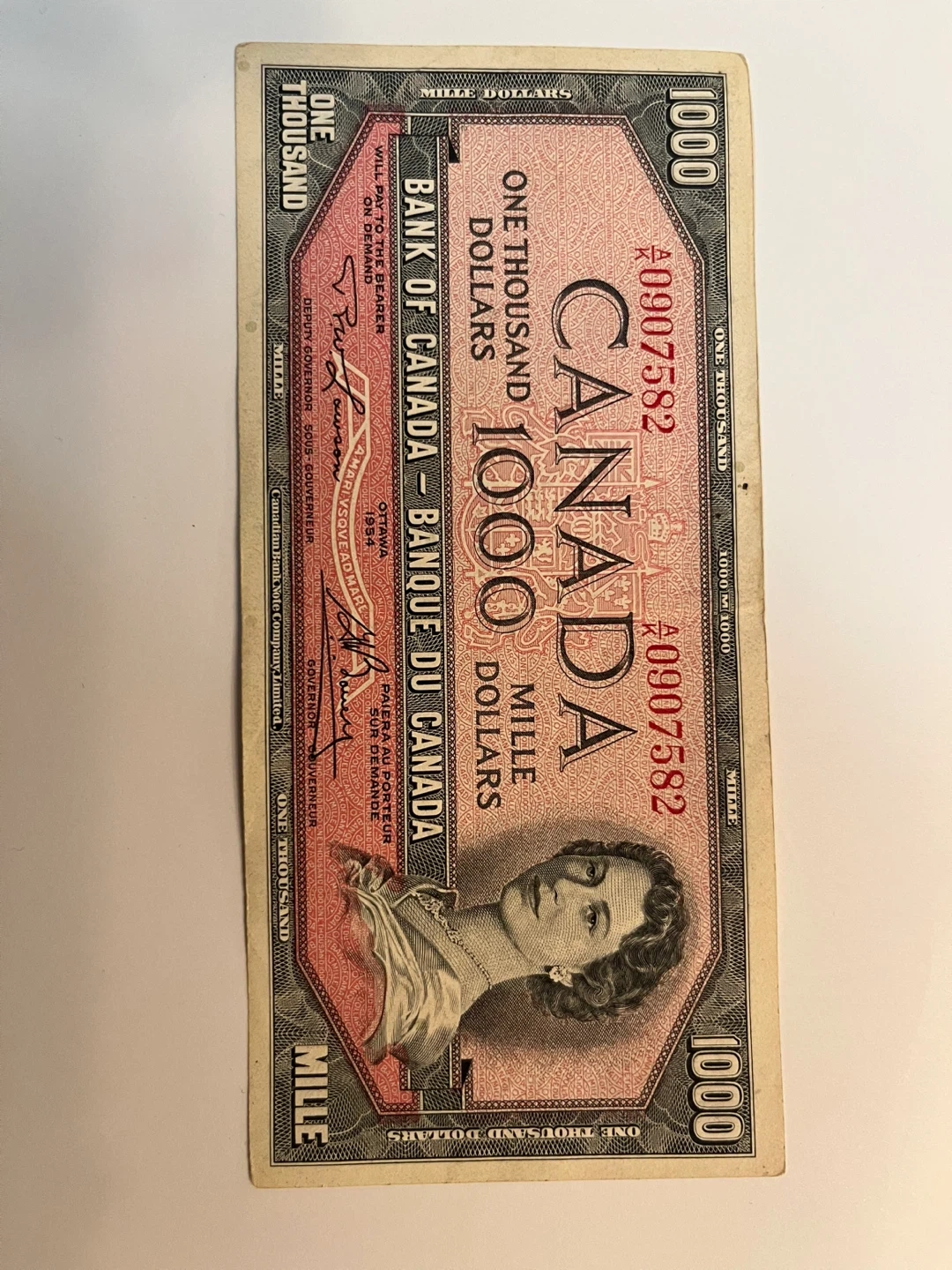 This is a Bank of Canada 1000 dollar note. It features "ONE THOUSAND DOLLARS" printed on it. The note is red and pink with a portrait of a woman.