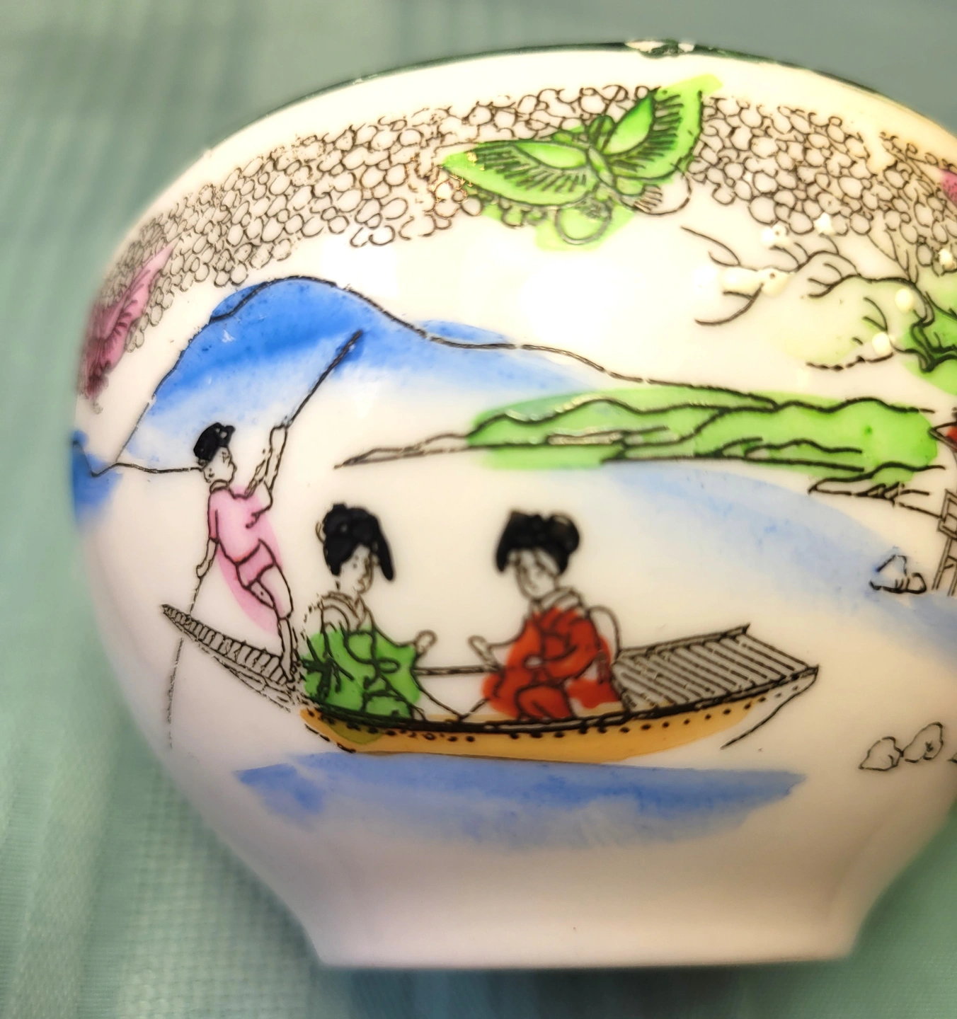 A standout feature of this set is the ornate moriage work—raised enamel beads and vibrant butterflies—bordering the rims, adding a beautiful tactile quality. The porcelain is delicate and lightweight, typical of high-quality Japanese export ware from this era.