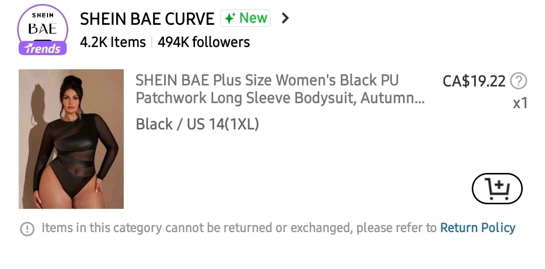 This is a SHEIN BAE Plus Size Women's Black PU Patchwork Long Sleeve Bodysuit. It features a PU material with mesh inserts and long sleeves. The size is US 14 (1XL).