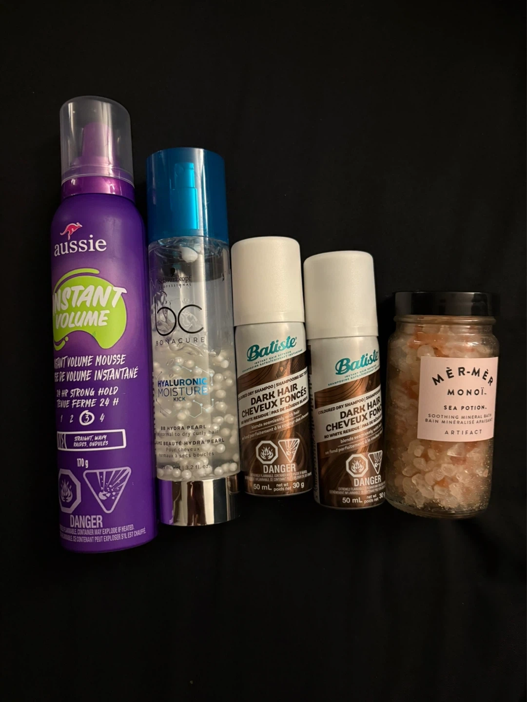 Includes Aussie Instant Volume Mousse (170g), BC Hyaluronic Moisture Kick with BB HydraPearl (120ml/3.2 fl oz), two Batiste Dark Hair Dry Shampoos (50ml/30g each), and Mer-Mer Monoï Sea Potion soothing mineral bath salts. Perfect for hair styling and bath relaxation.
