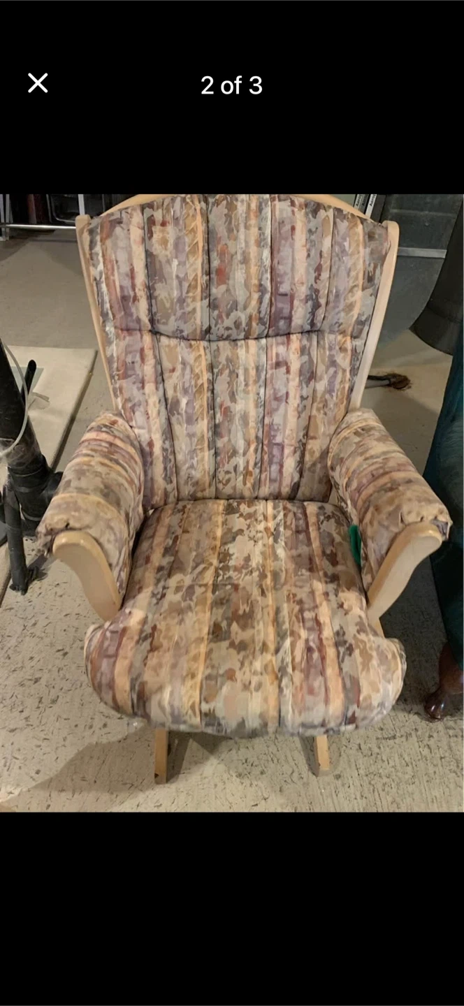 This is a comfortable recliner chair with a unique floral-striped fabric. It has padded arms and a supportive back. Wooden legs provide stability.