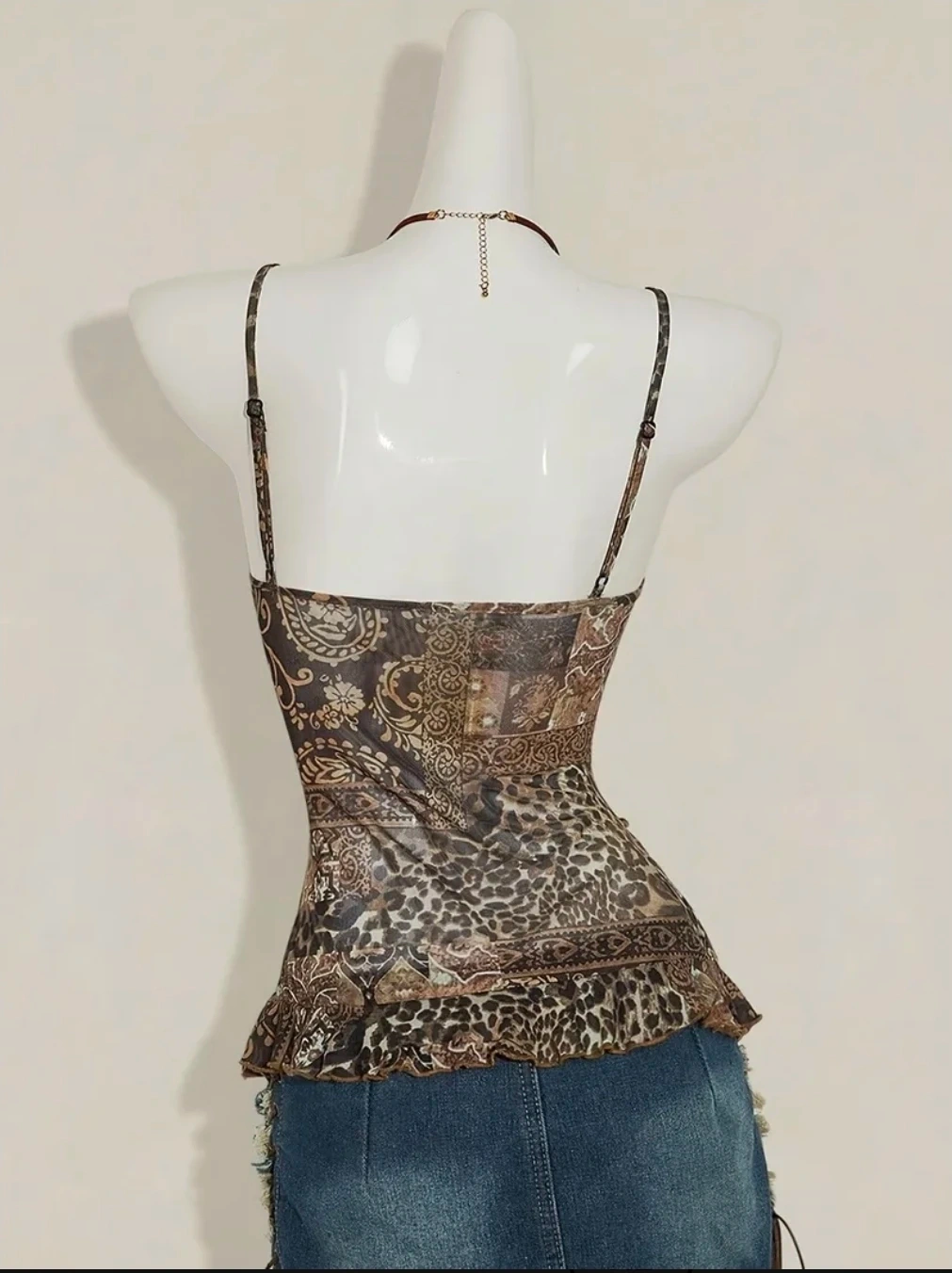 Y2K Mixed Print Ruffle Cami Top | Leopard & Floral