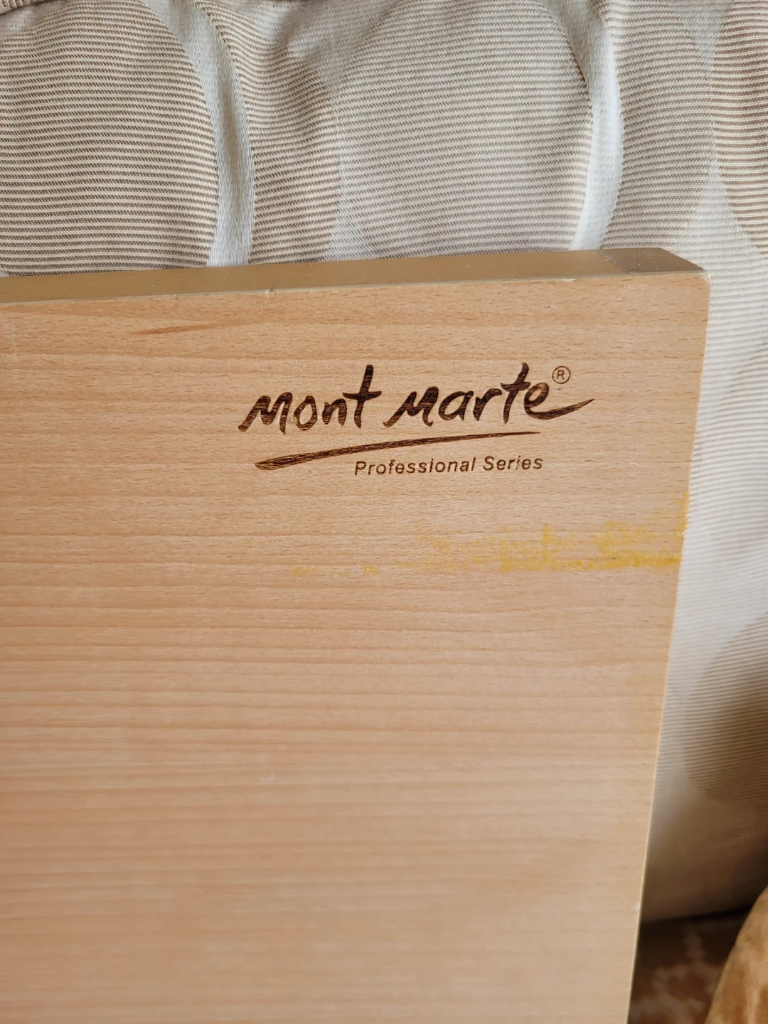 This is a Mont Marte Professional Series wooden art easel. It's made of light-coloured wood and folds flat for storage. The easel has adjustable supports for holding canvases or drawing boards.