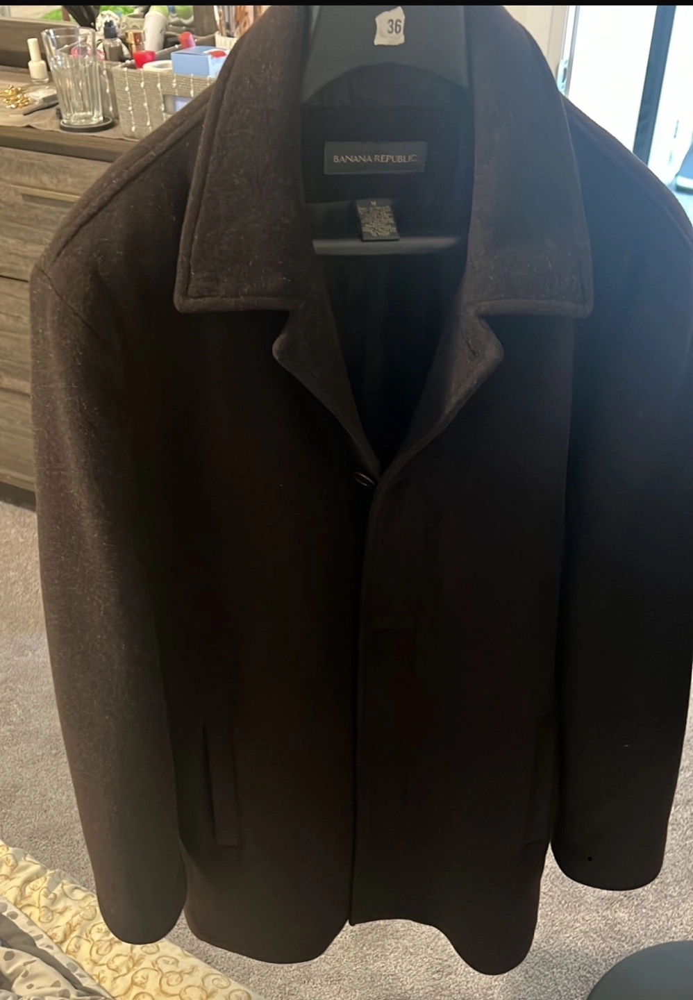Classic men's overcoat. Dark brown colour. Long sleeves. Simple design. Size Medium.but fits like large