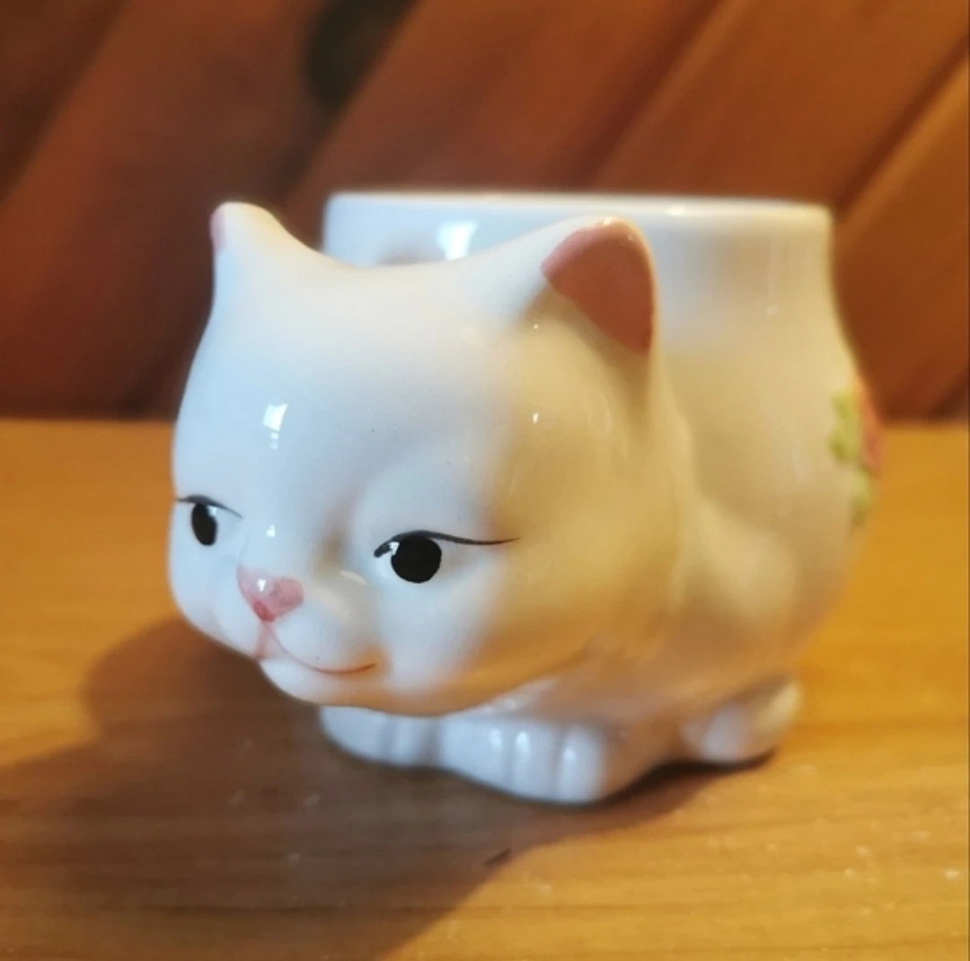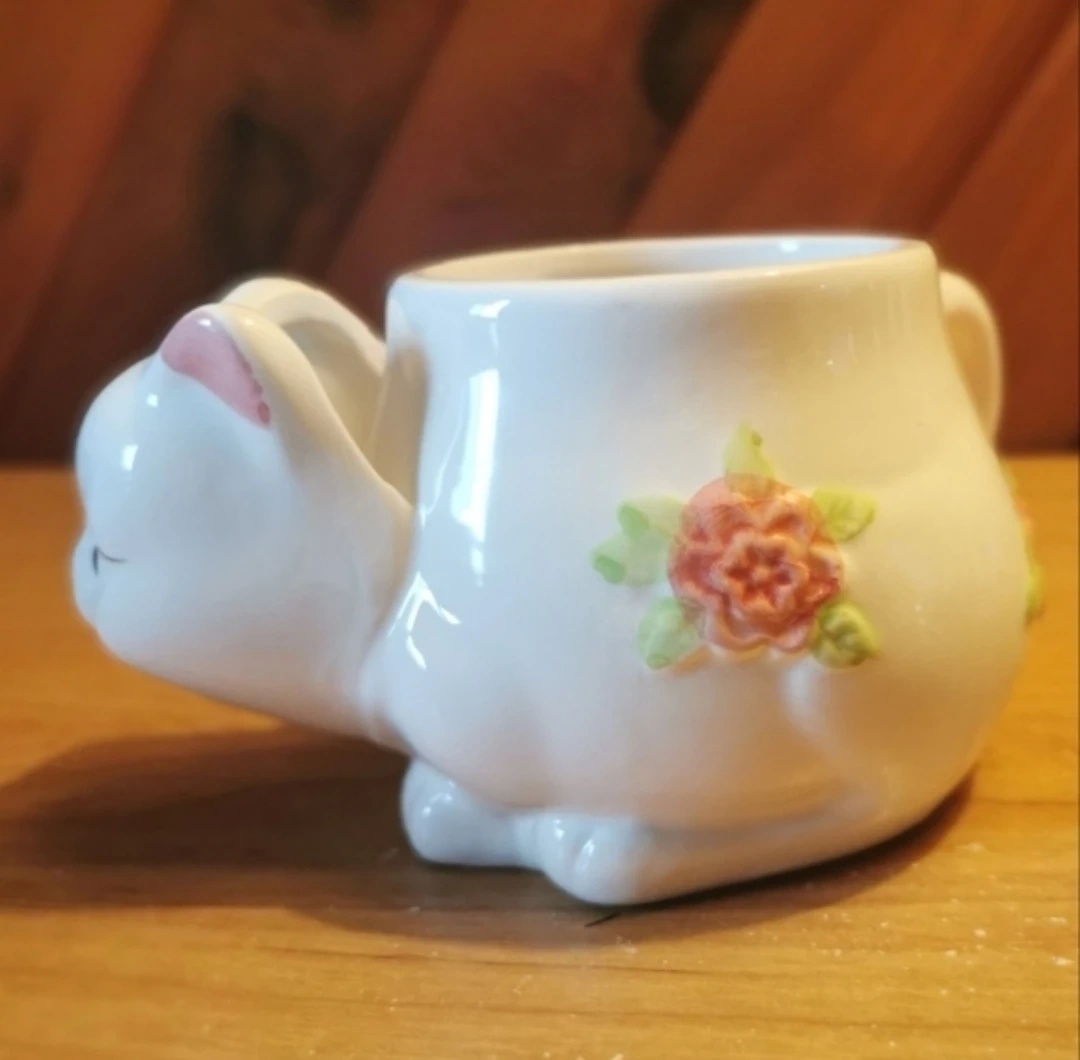 Vintage 3D White Cat Mug With Pink Roses.