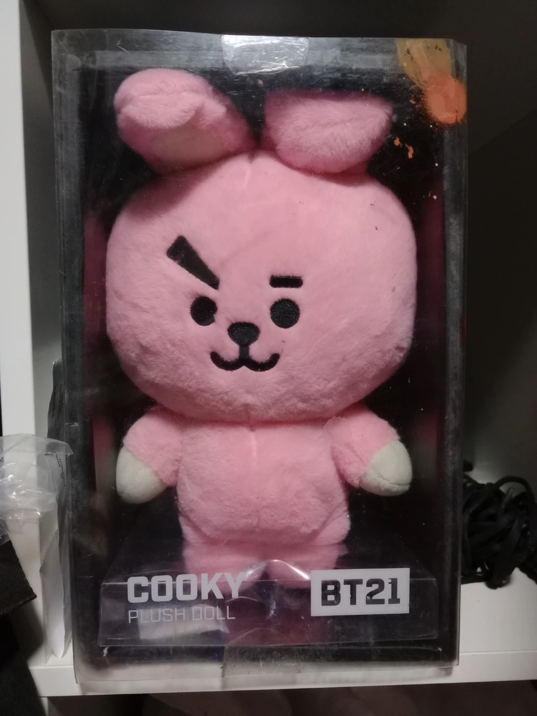 This is a pink Cooky plush doll from BT21. It's a soft toy in its original packaging. This plush doll is great for fans of the character!