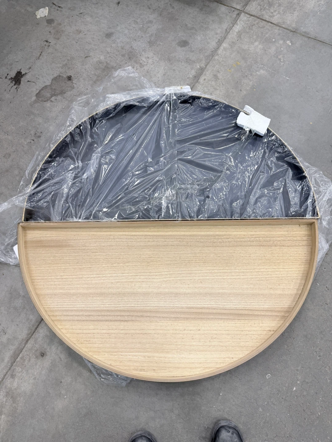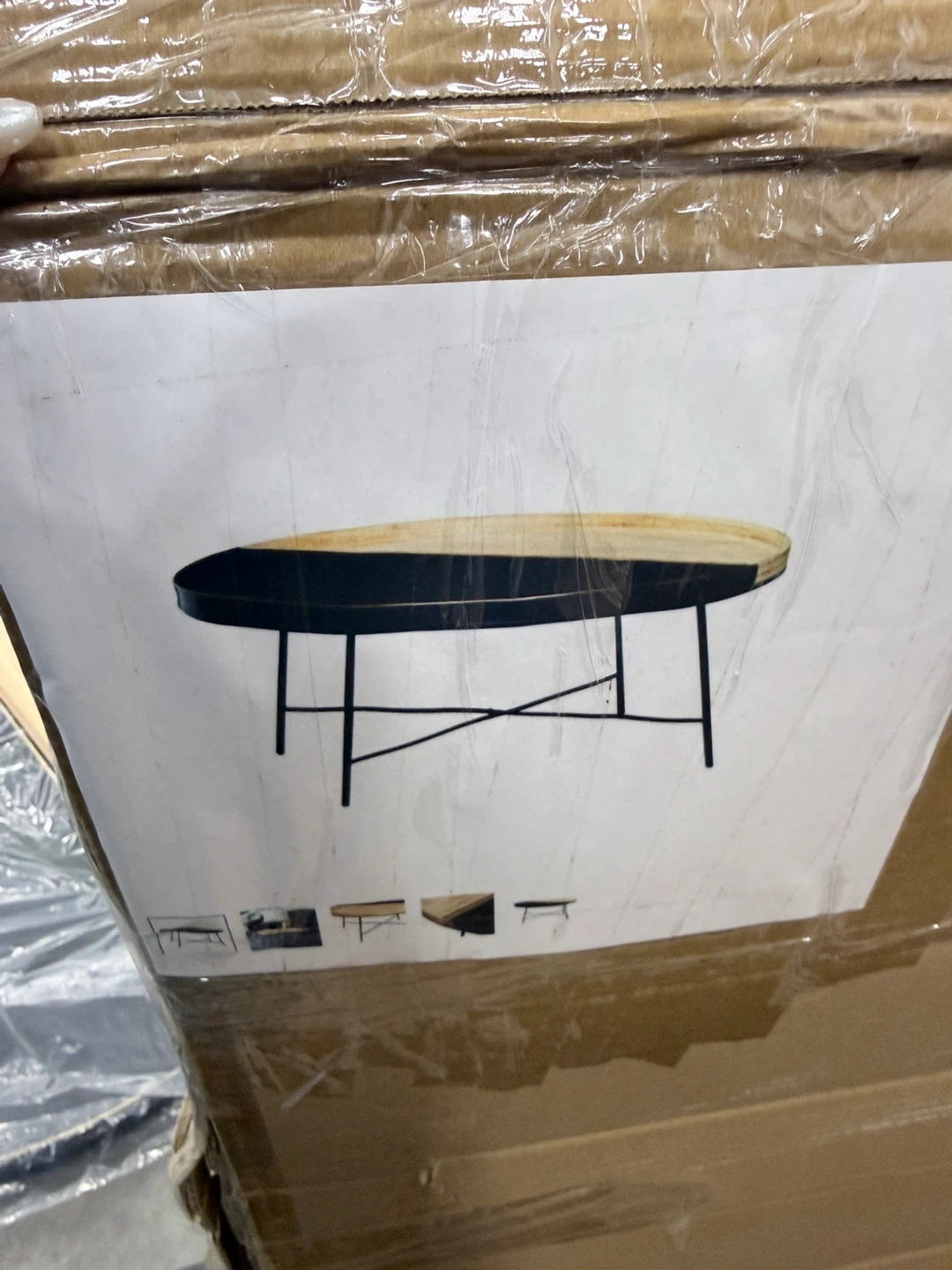 Selling a round coffee table, still in its original packaging! The box says it's 36 inches in diameter and 18 inches high. It's a really nice piece, but it doesn't quite fit my space
