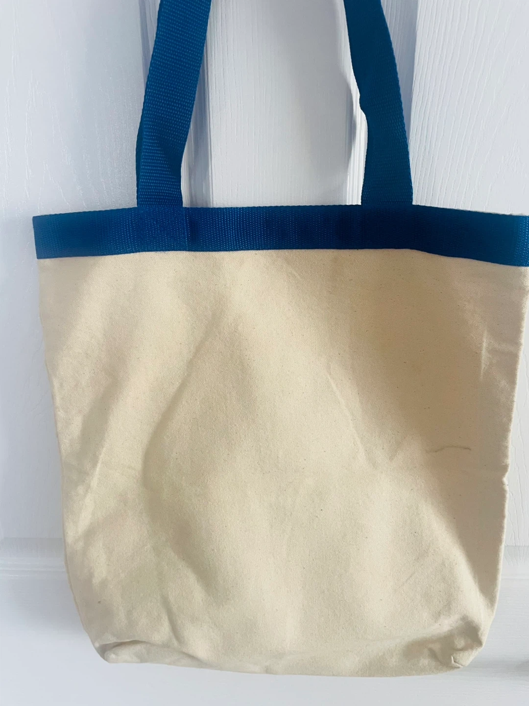 Canvas tote bag featuring a fun graphic with a goldfish and the phrase "Paws, Claws, Scales and Tales!". It has blue handles and a blue trim. Great for carrying books or groceries!