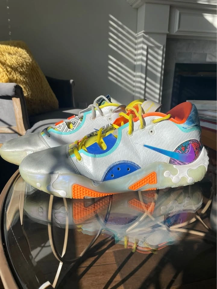 Selling a pair of Nike PG 6 basketball shoes in used, like-new condition. Lightly worn and well maintained. Worn only a few times. Clean uppers with minimal creasing. Soles still have excellent traction. No rips, tears, or sole separation. From a smoke-free home. Shoes only (no box).