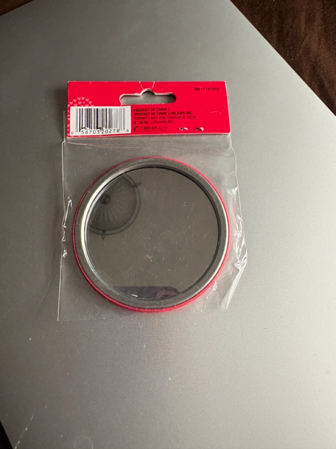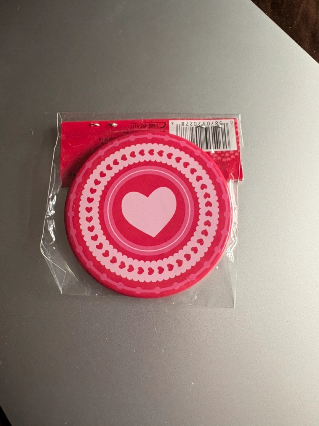 This round pocket mirror features a pink and white heart design on the back. It's perfect for quick touch-ups on the go! A handy accessory for your purse or bag.