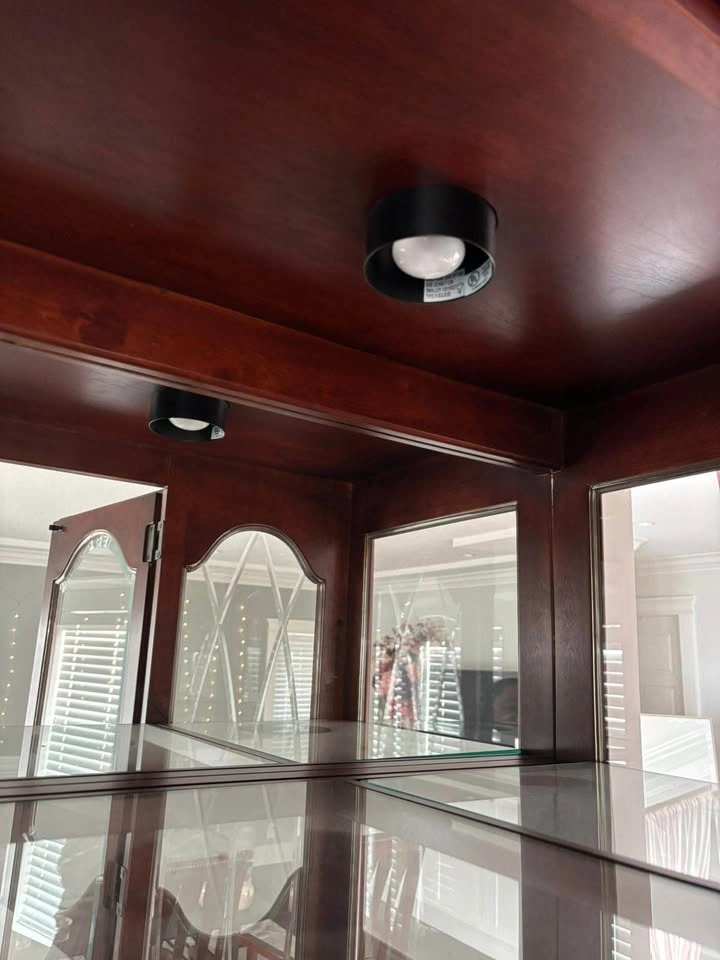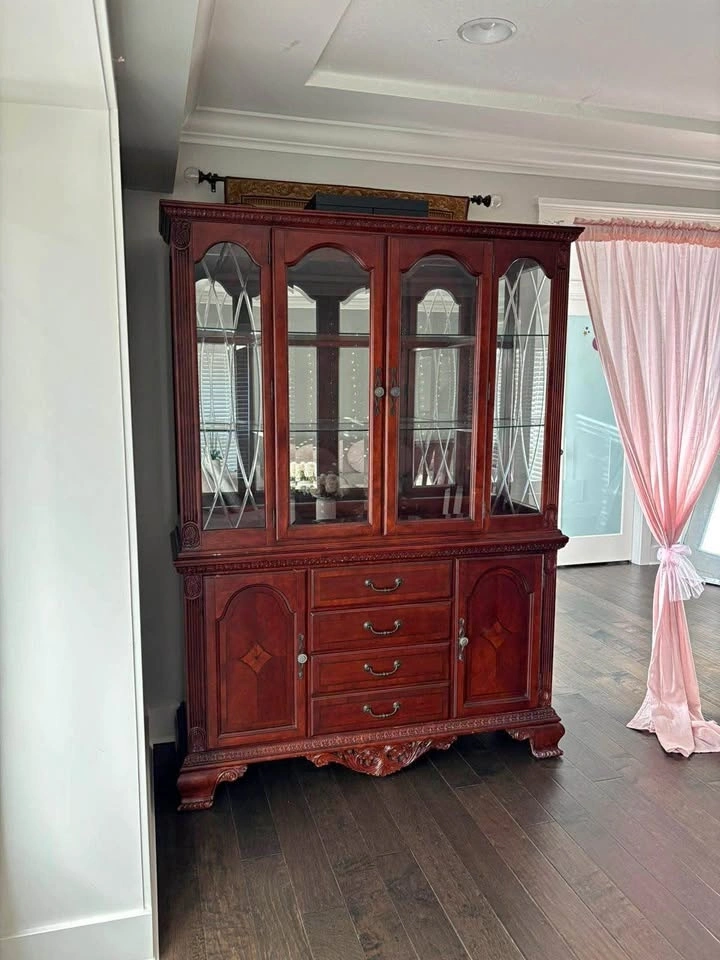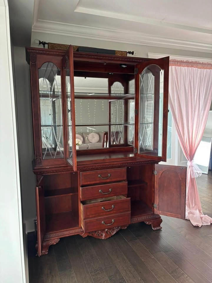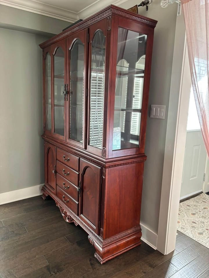 Very good condition wooden buffet display cabinet with plug-in light. Cash and pickup only please! Width 56 inches, Depth 18 inches, Height 77 inches. I won’t be able to take it apart, so please make sure you have a vehicle big enough to take it.