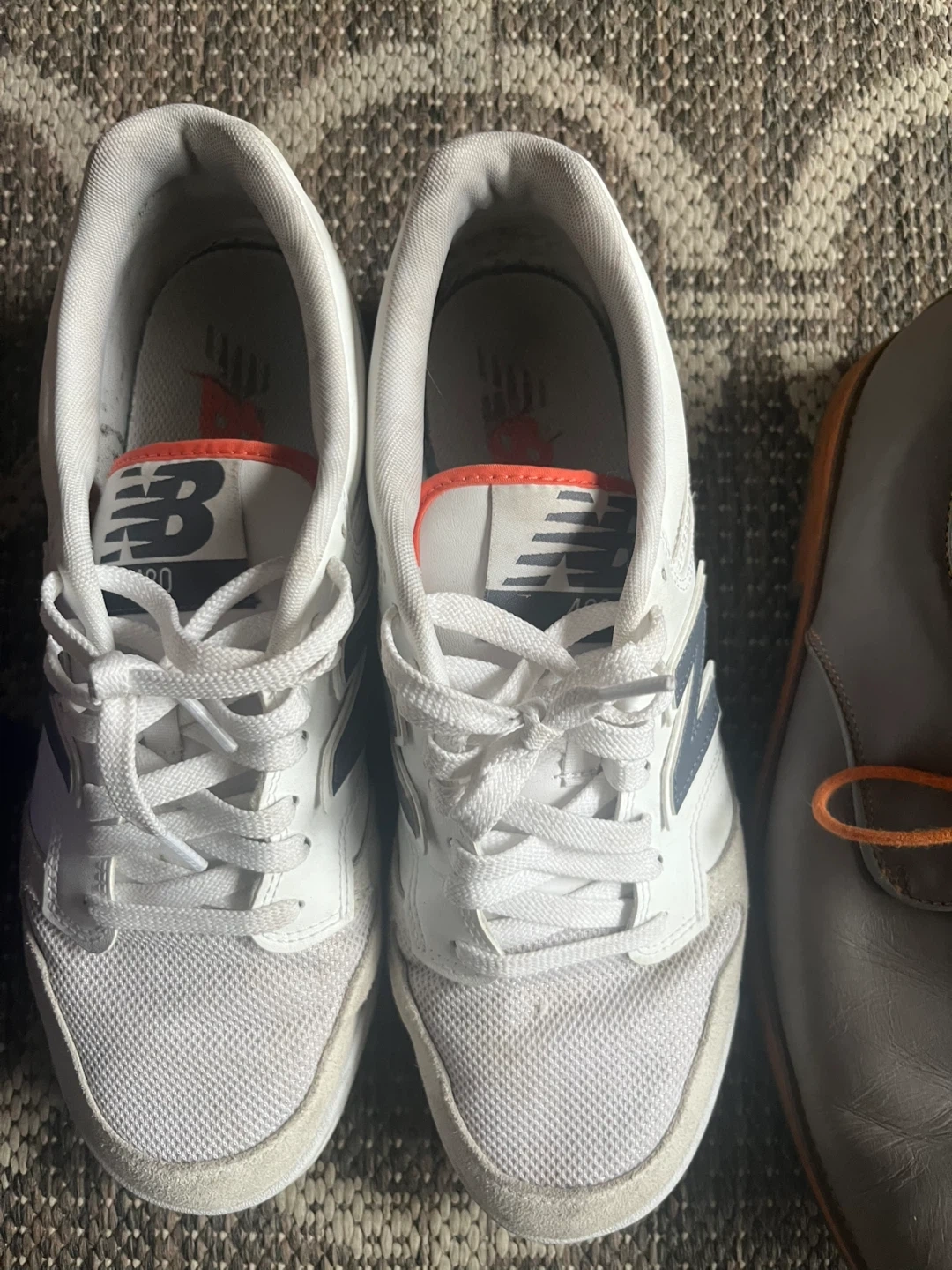 White New Balance sneakers with navy accents and orange detailing. With box. Worn less than 10 times.