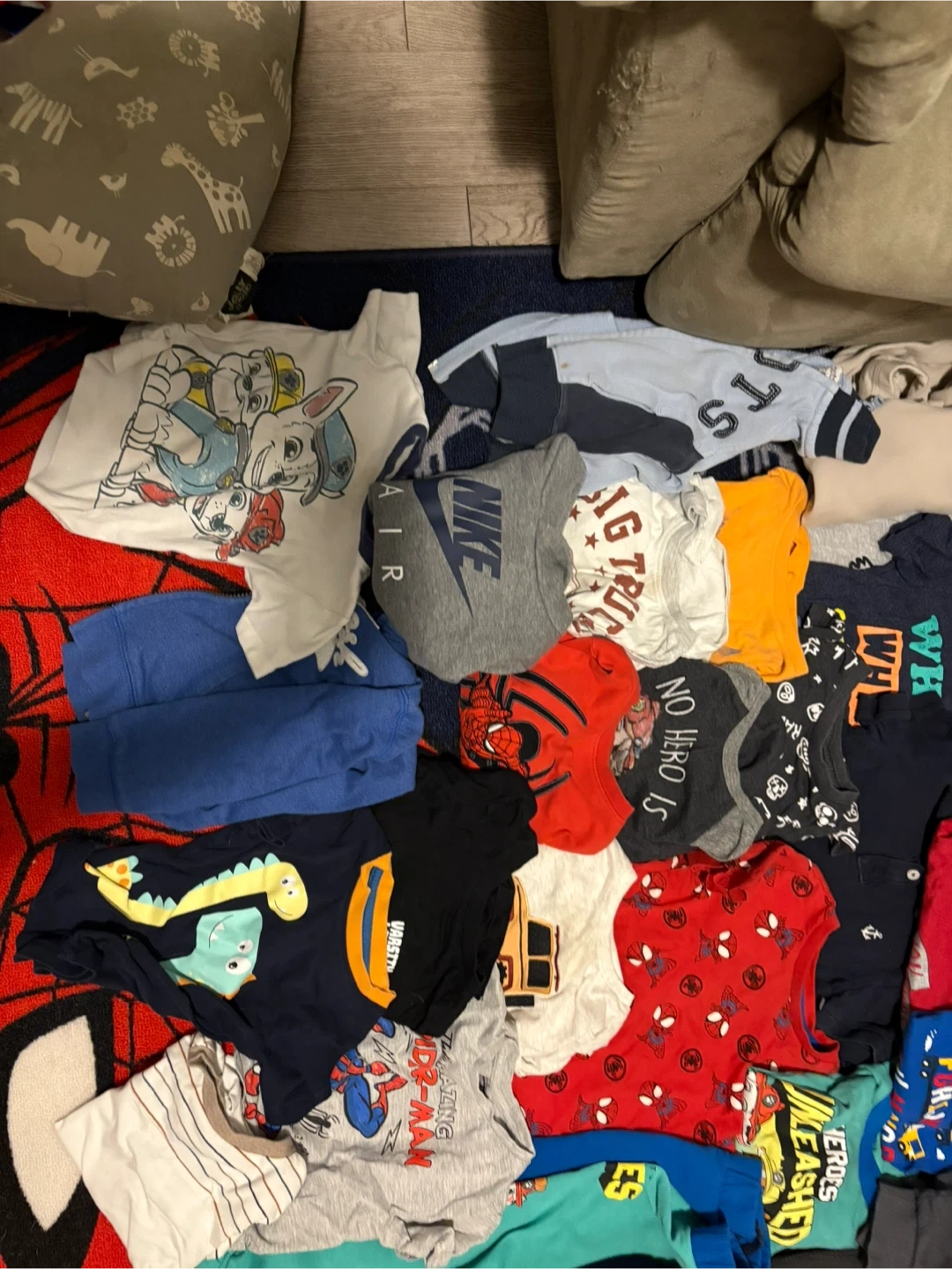 This is a bundle of various kids' tops and bottoms. Includes items with Spiderman, Paw Patrol, and dinosaur graphics. Some pieces are Nike brand. Lots of colours and styles for casual wear.39 pieces in total 2T