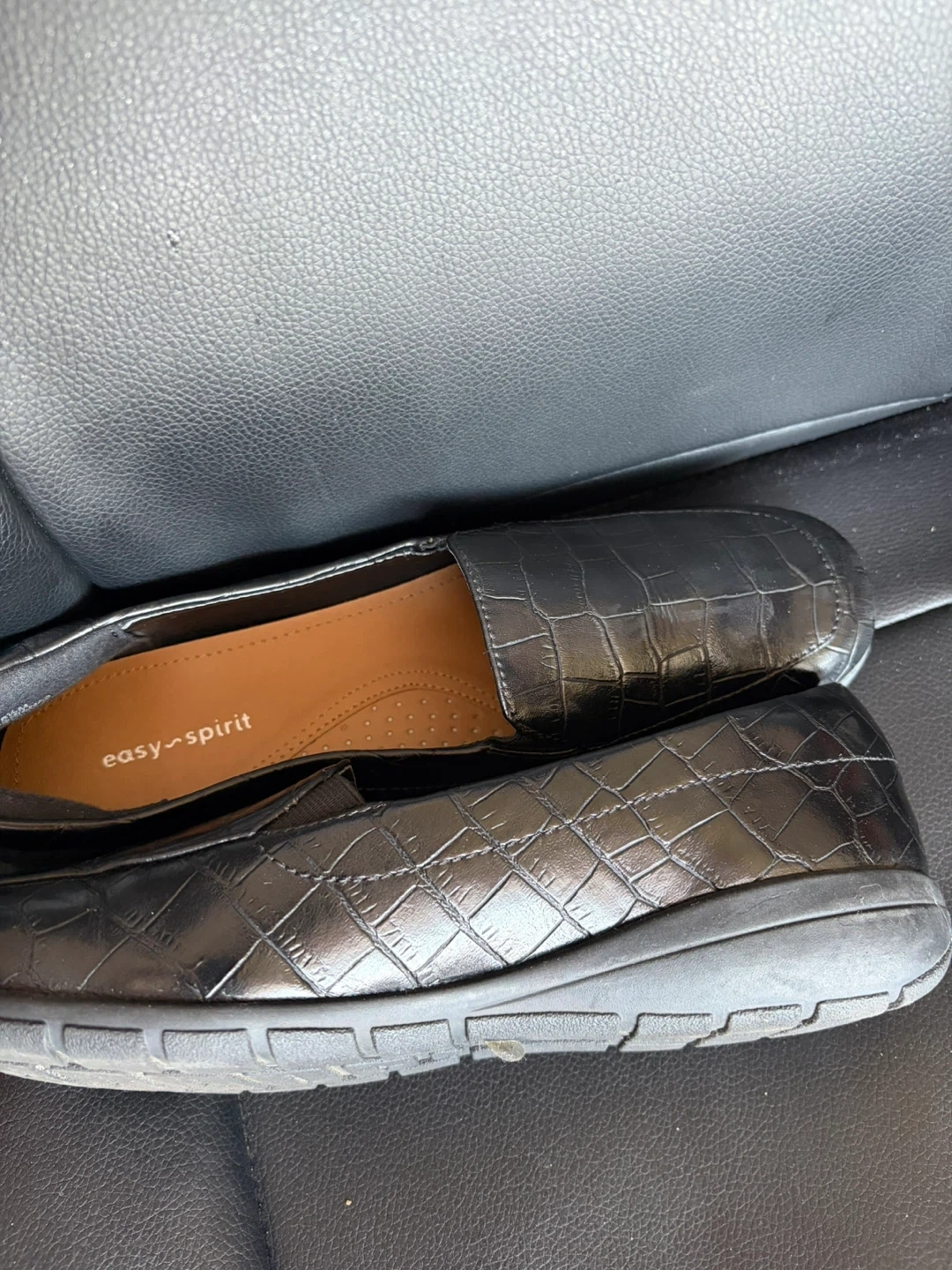 Easy Spirit loafers with a black croc-embossed finish. These slip-on shoes feature leather and a cushioned insole with arch support.