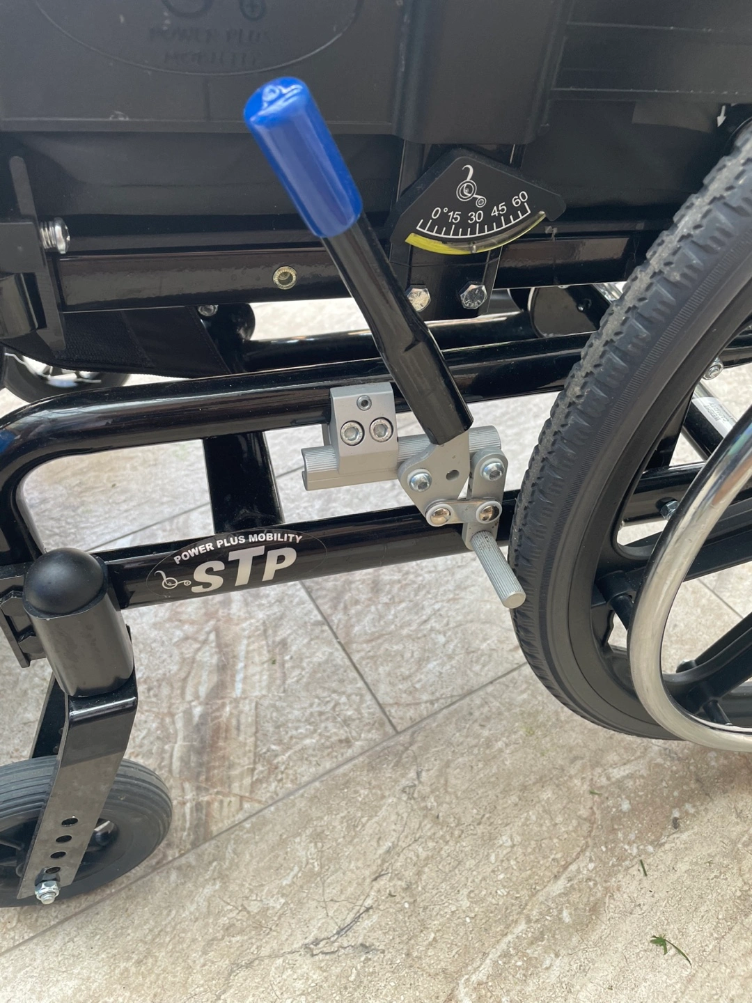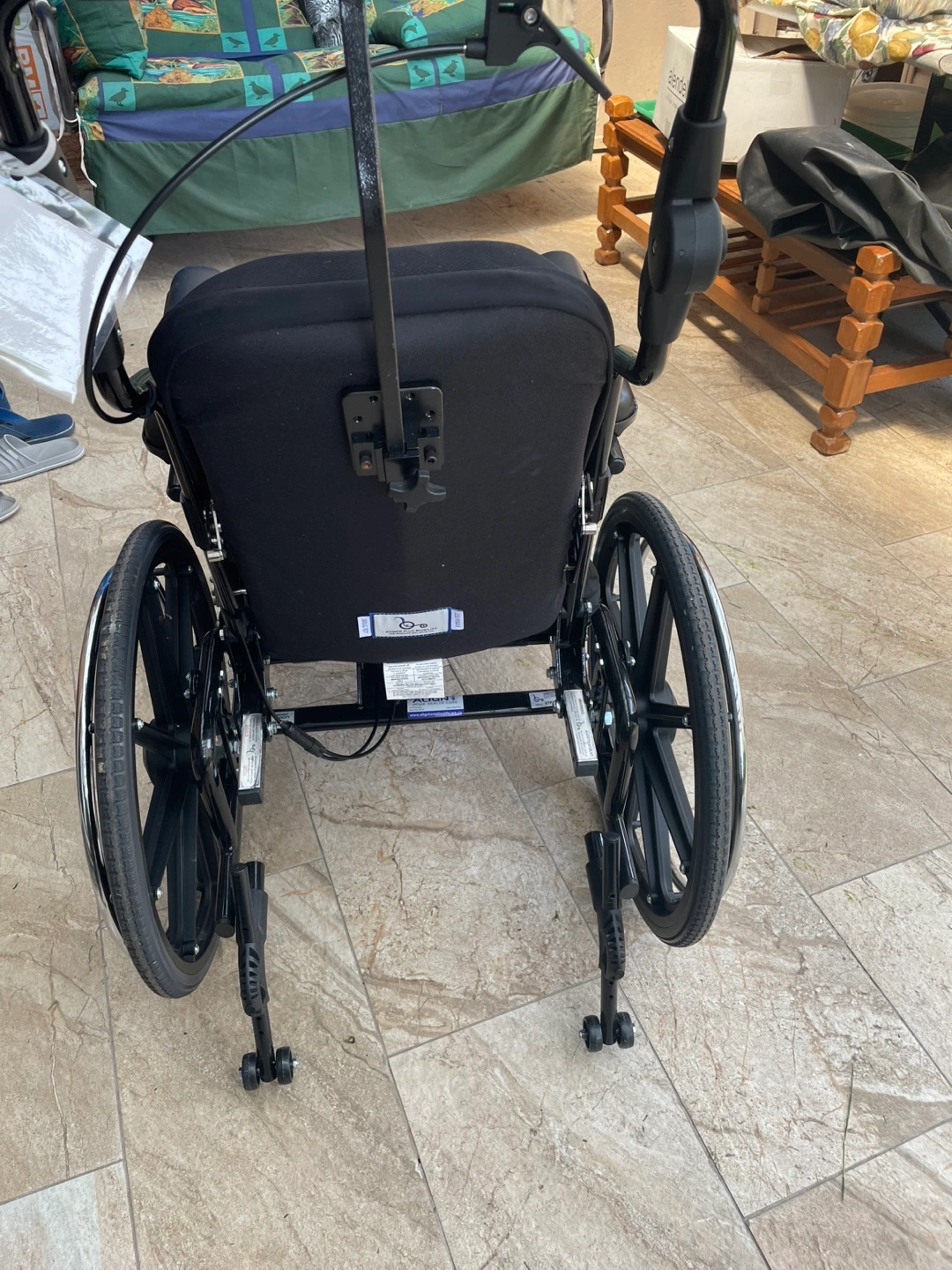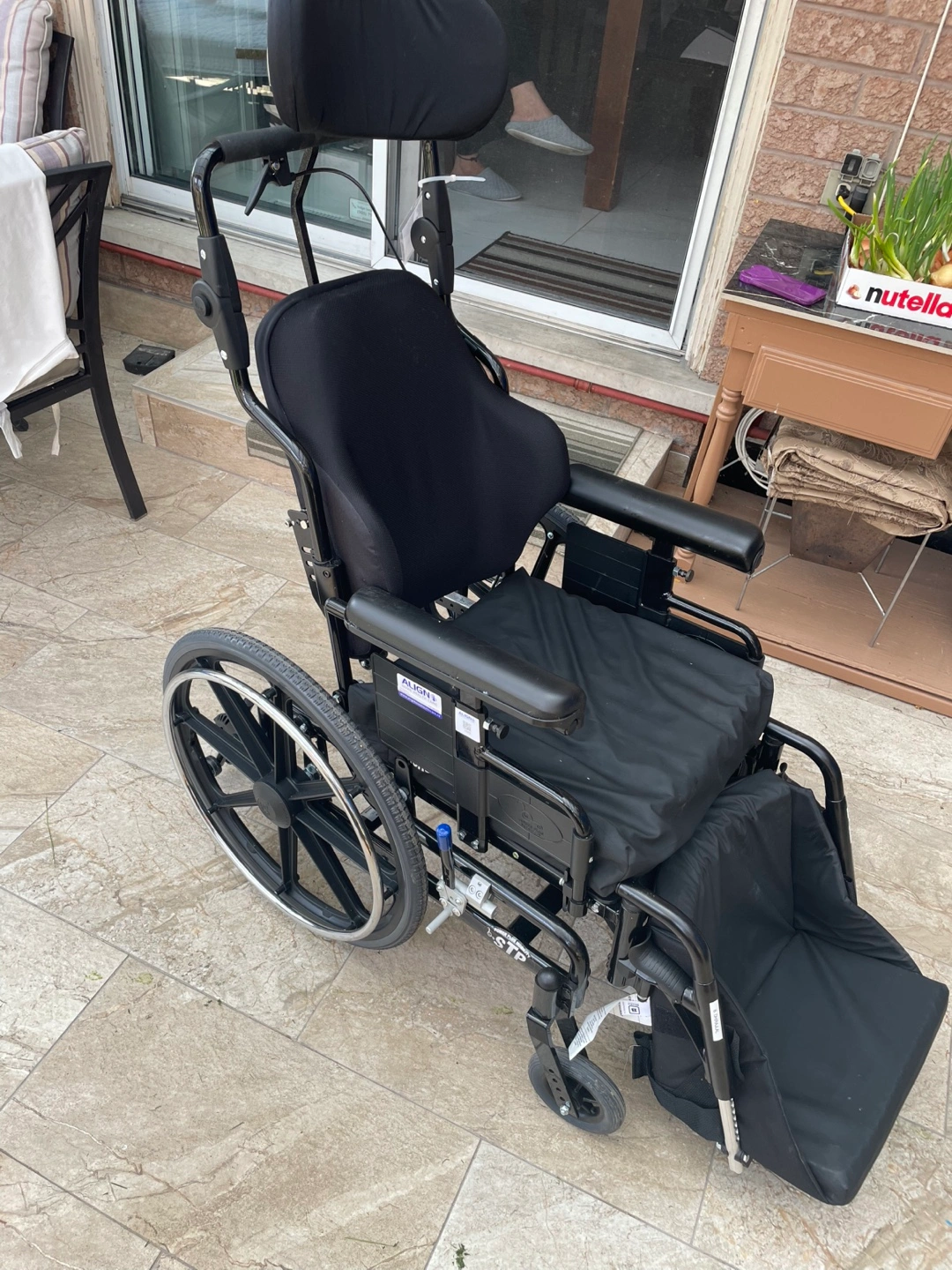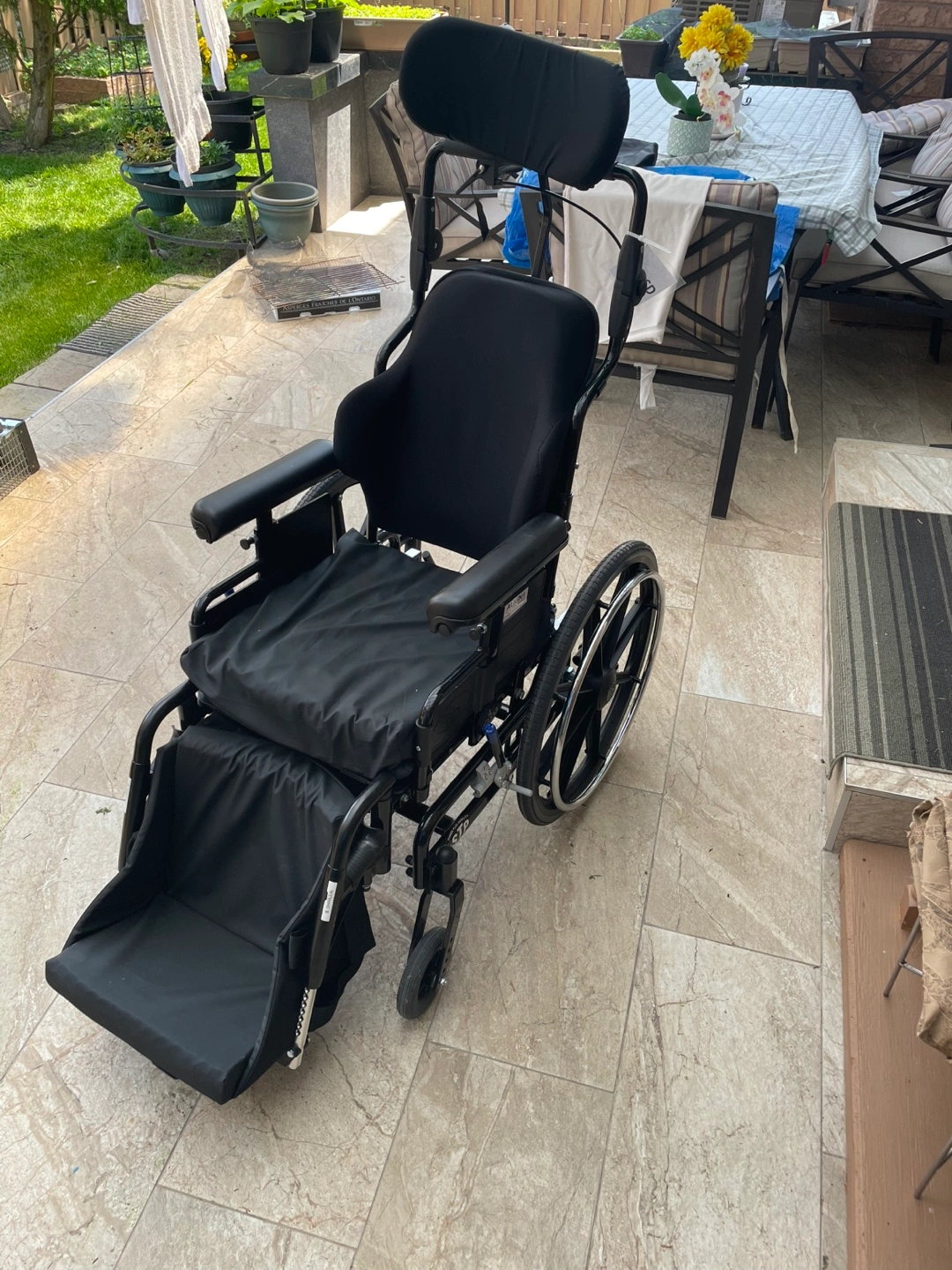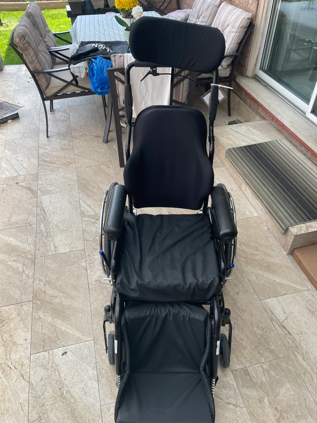 Heavy-duty wheelchair. Features reclining backrest and elevating leg rests. Includes headrest. Good condition.