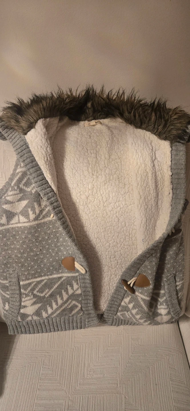 This is a cozy knit sweater vest featuring a grey and white geometric pattern. It has faux fur trim around the hood and collar, along with wooden toggle closures. Perfect for a warm cozy layer in a cold day.