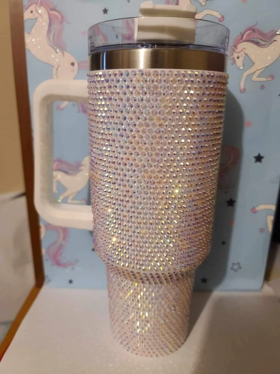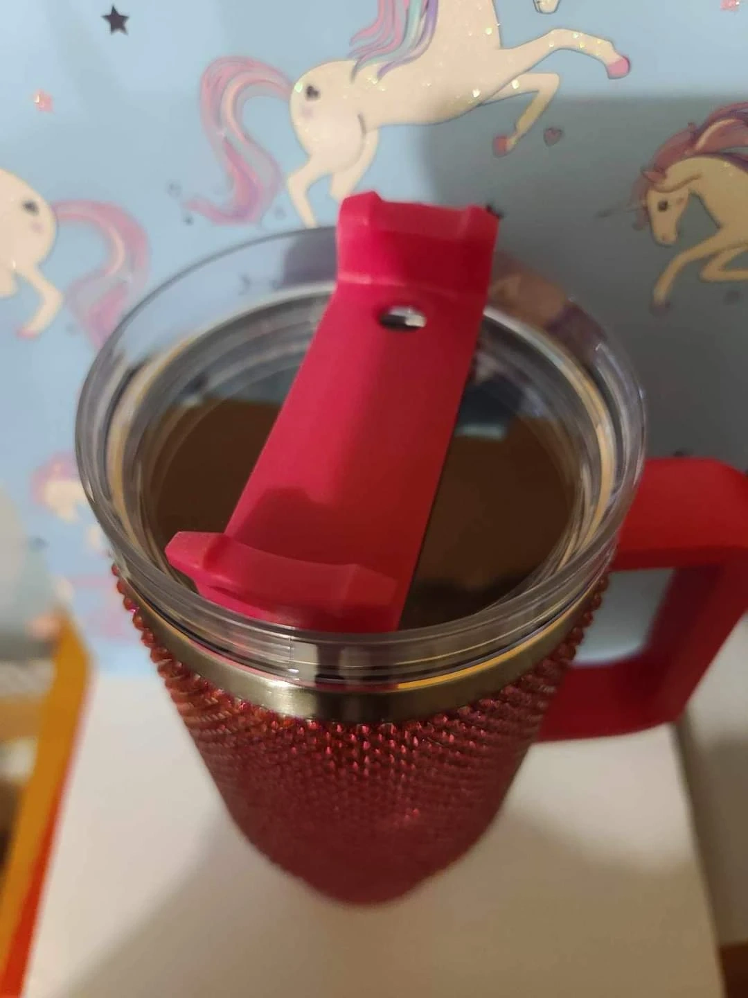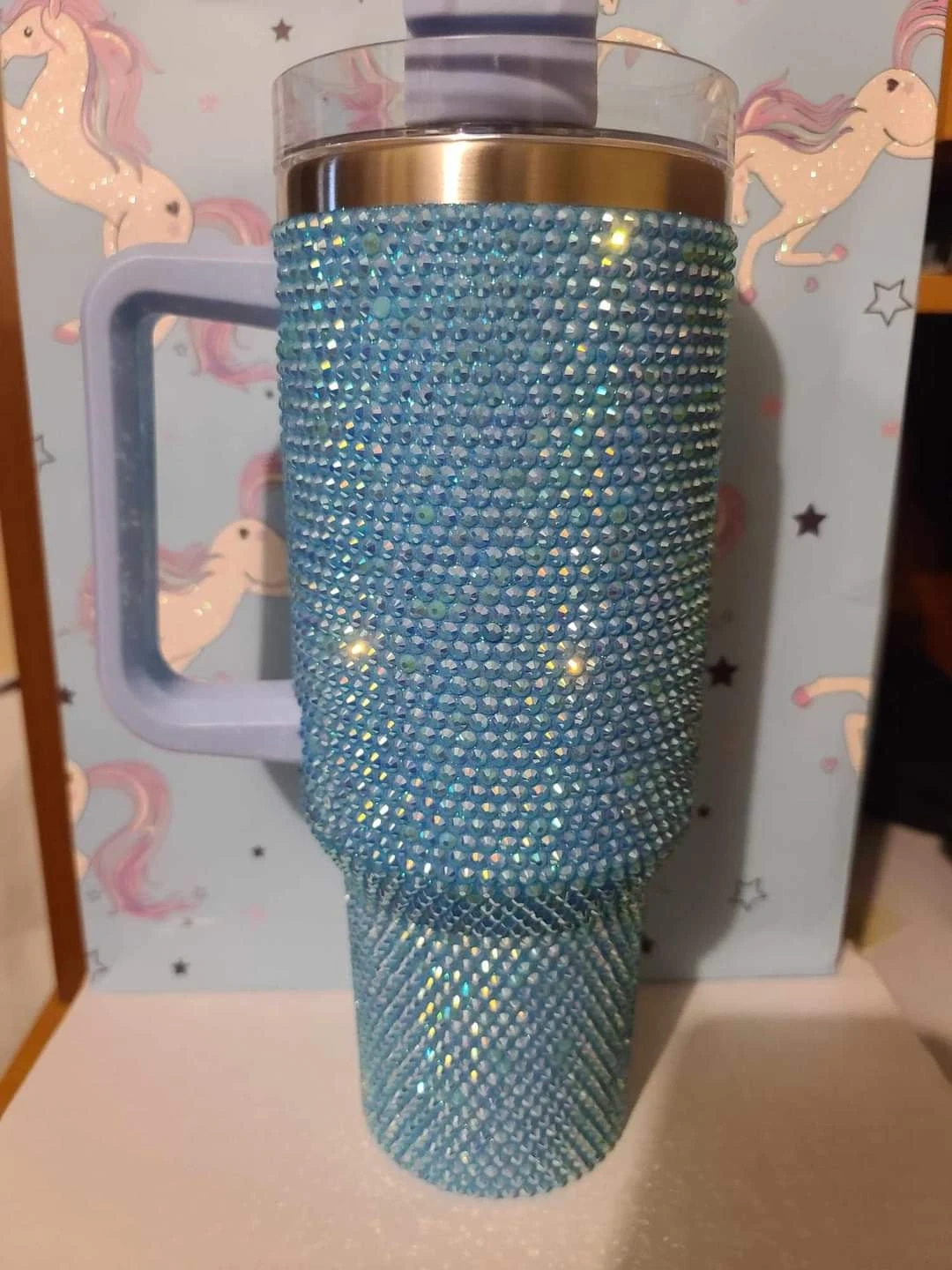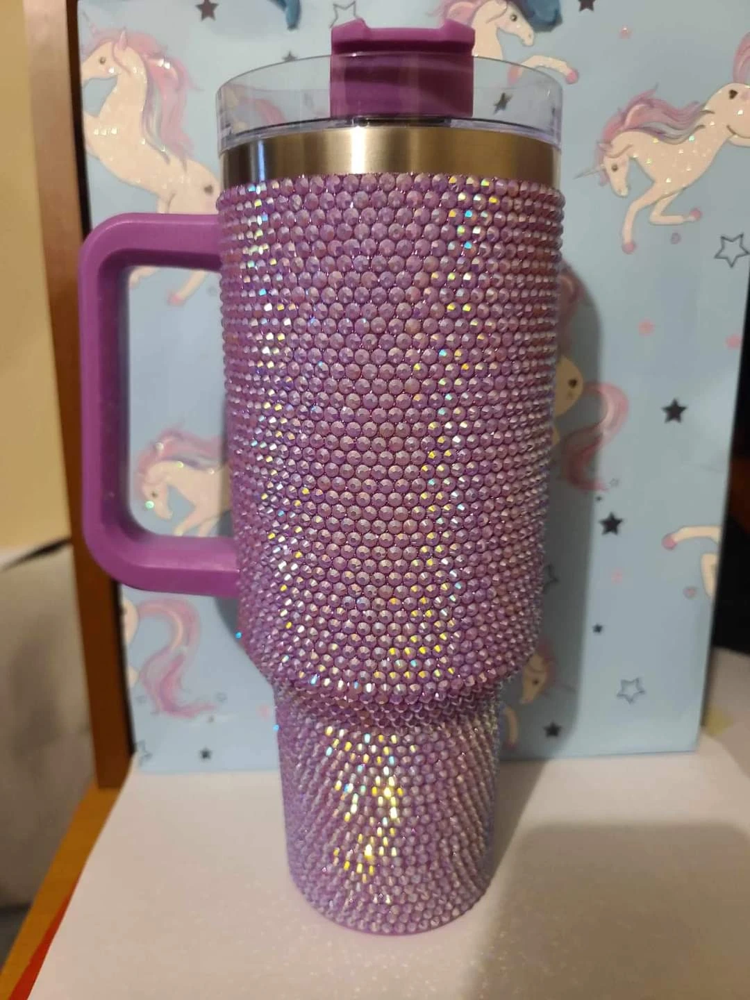 Check out these beautiful rhinestone tumblers! They come in a variety of colours including red, black, purple, and iridescent. They have a handle and a lid with a straw opening. Perfect for keeping your drinks cold or hot!