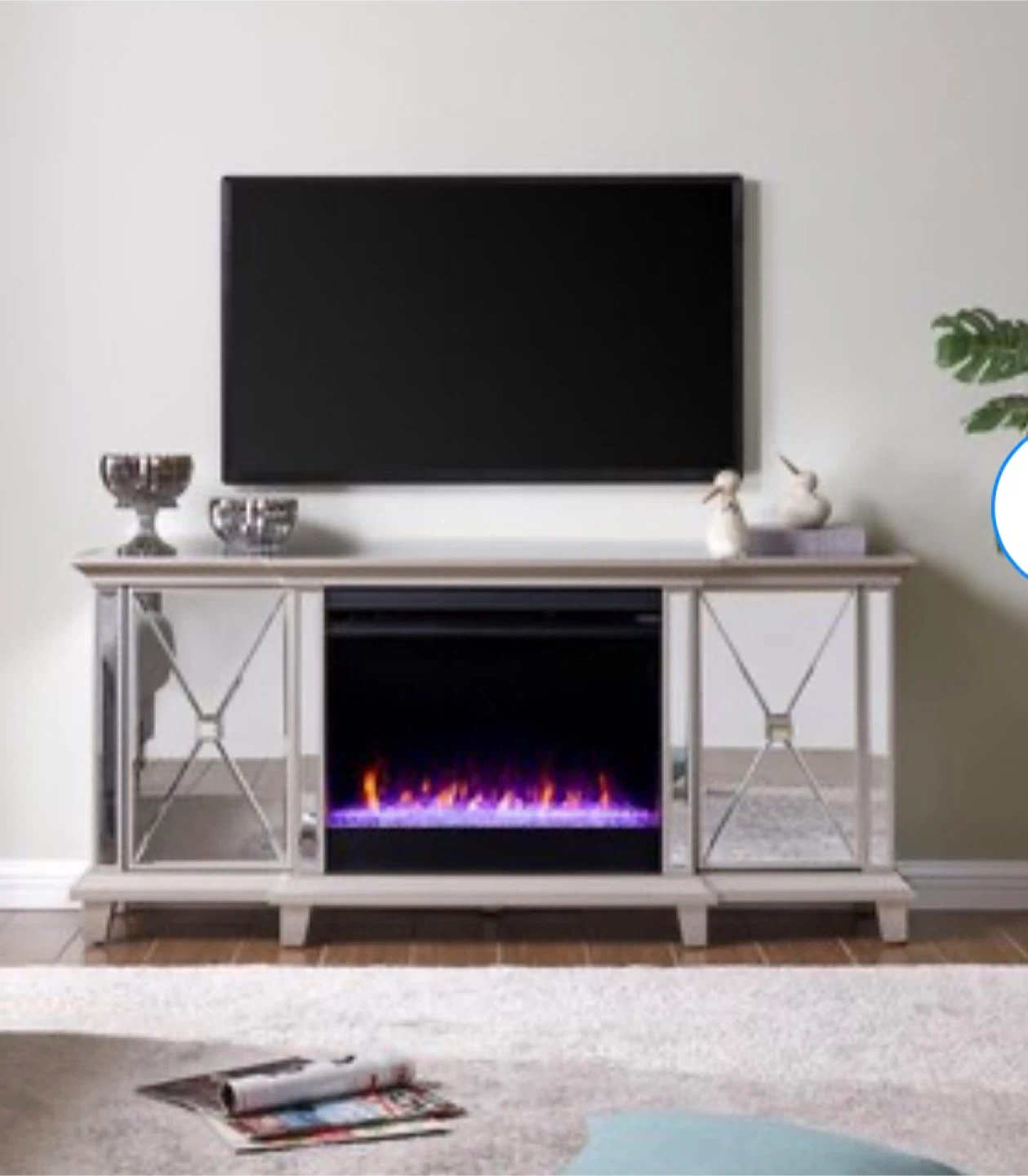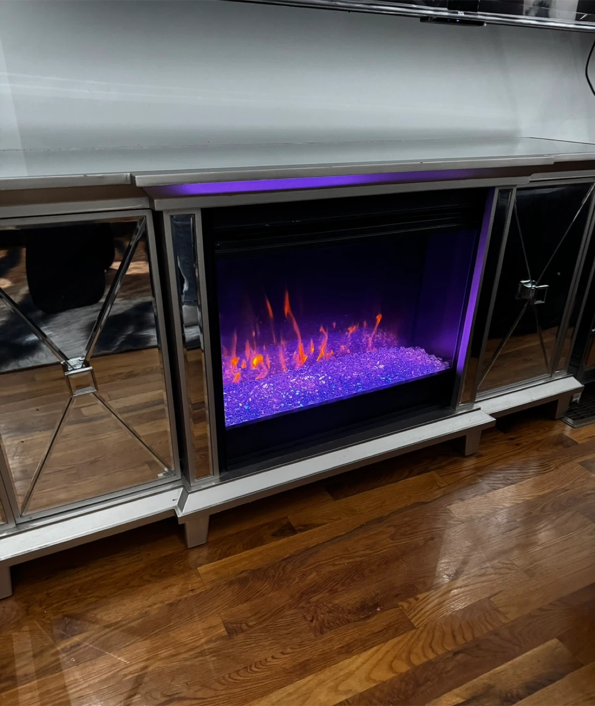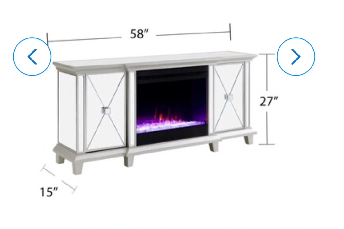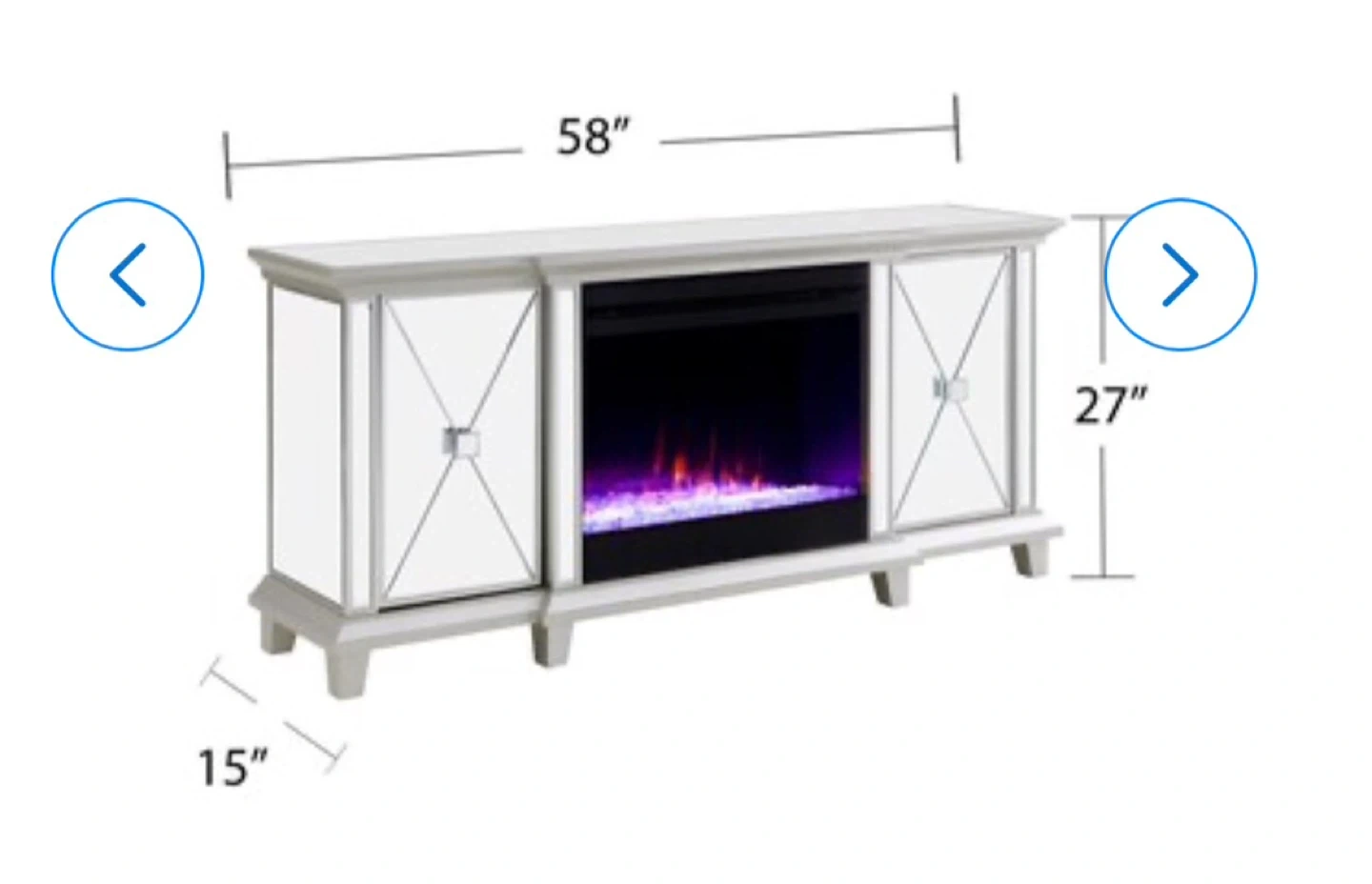 Selling a mirrored fireplace TV stand. It measures 58 inches in length, 27 inches in height, and 15 inches in depth. It's a stylish addition to any living room!