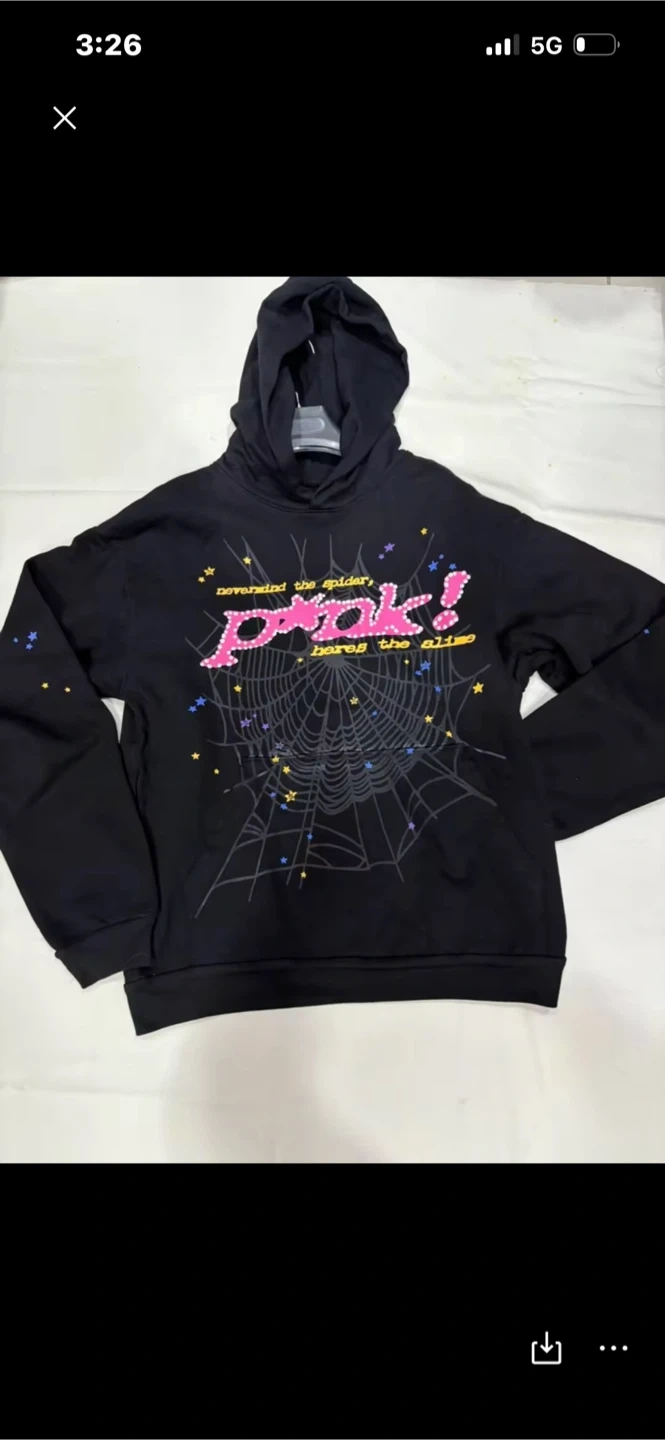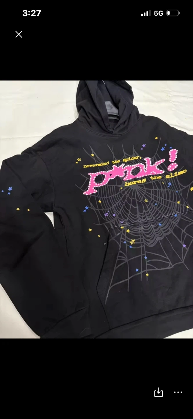Selling a gently used SP5DER hoodie in black! It's a size M and features a unique design with a spiderweb and "P*nk!" lettering. The hoodie is made of cotton and is in great condition. Perfect for adding a bit of edgy style to your wardrobe!