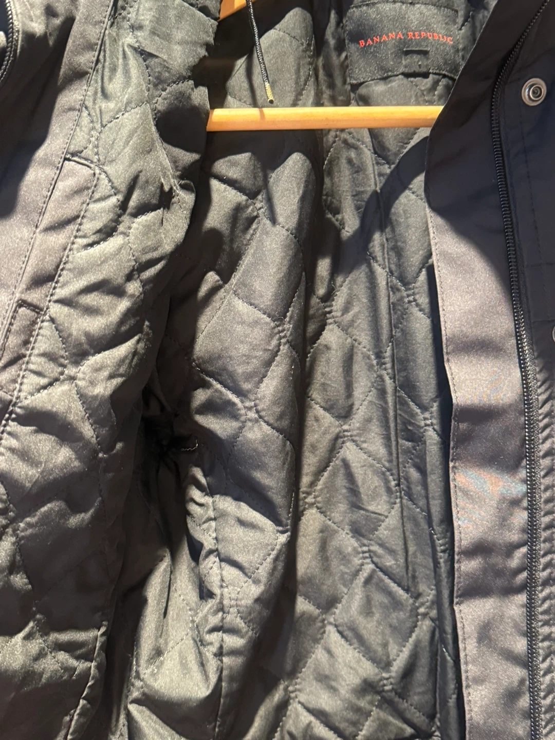 Selling a Banana Republic jacket in size XS. It's a sleek black colour and made with 100% polyester for the shell, lining and filler. Perfect for layering!
