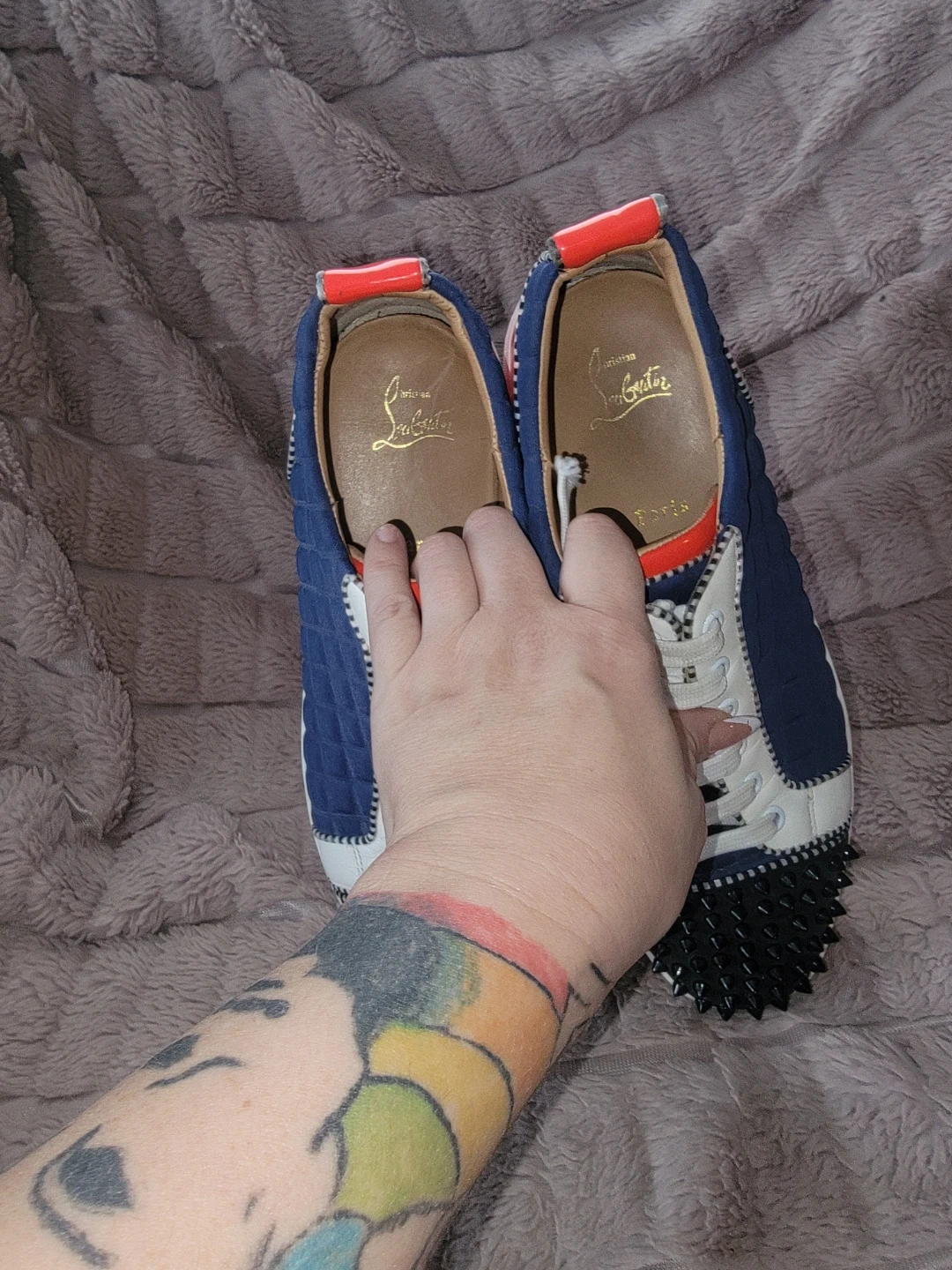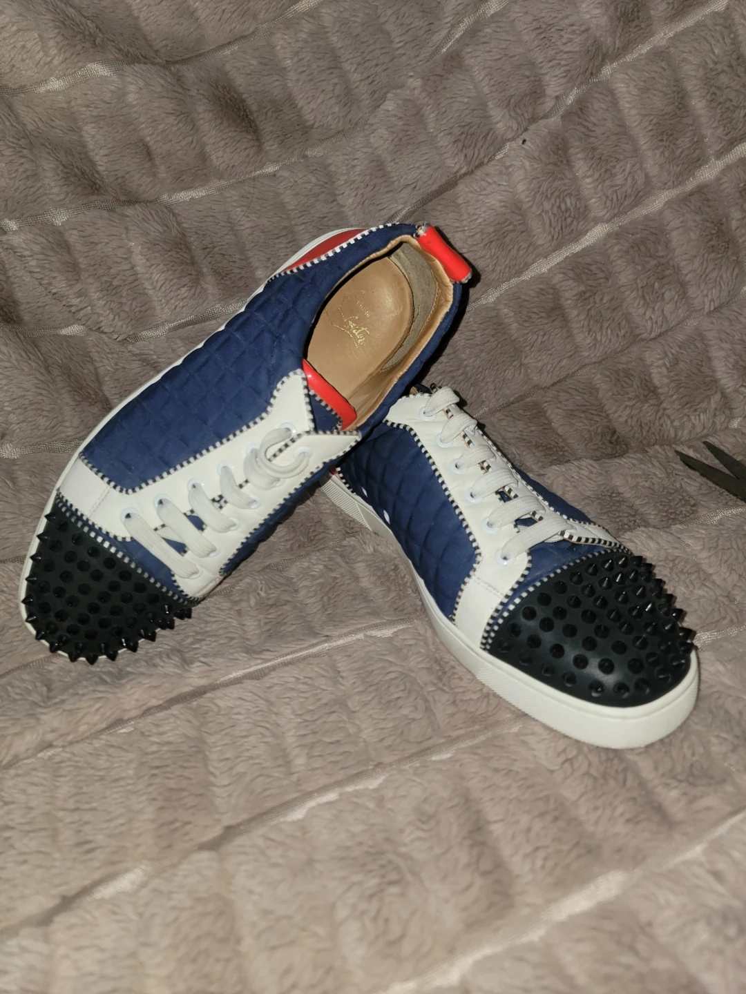 These Christian Louboutin Louis trainers feature the iconic spikes on the toe. They're made with a quilted blue and white upper with red accents. The signature red sole is present on both shoes.