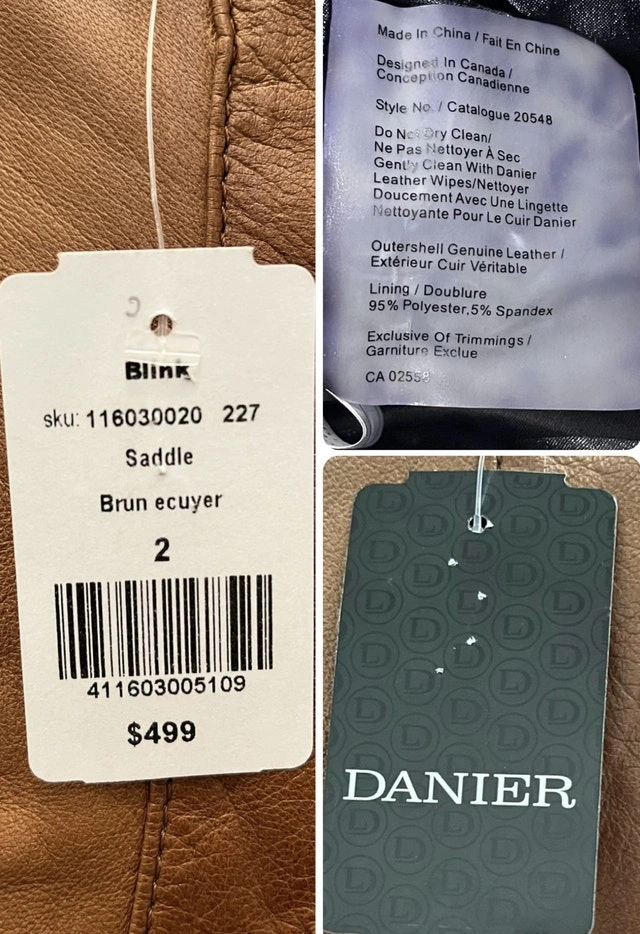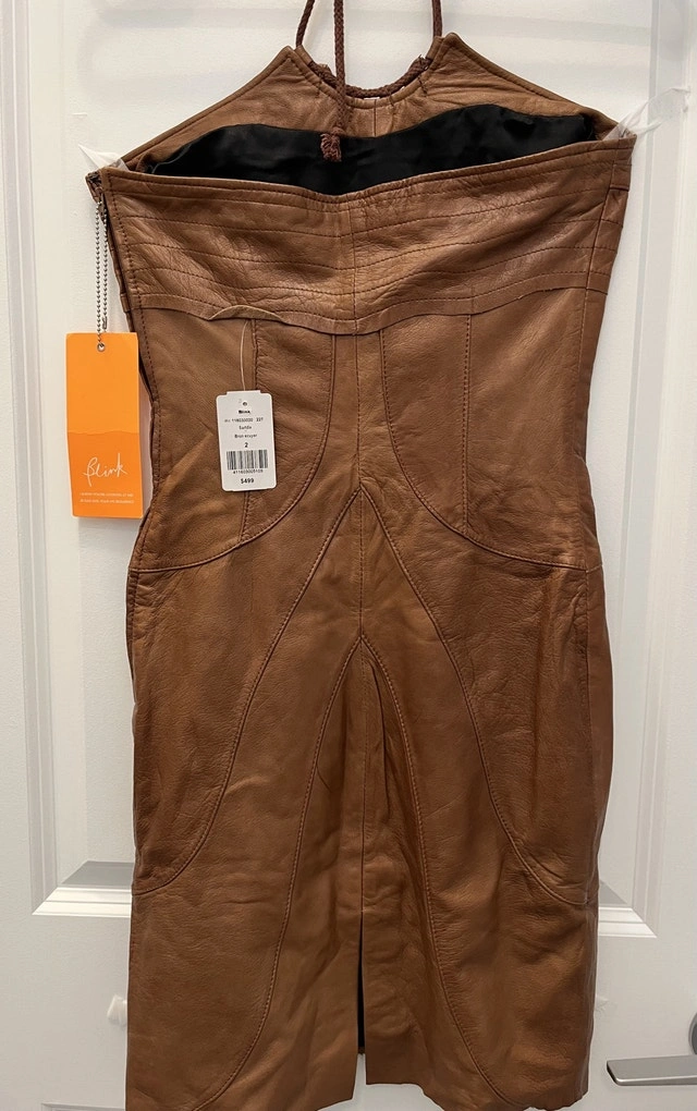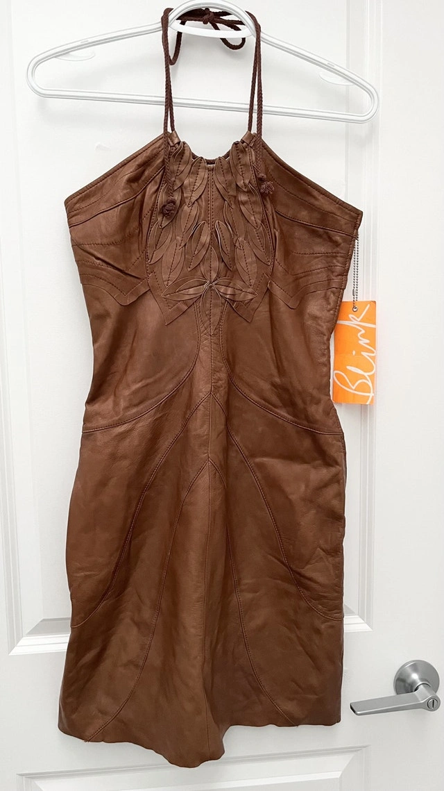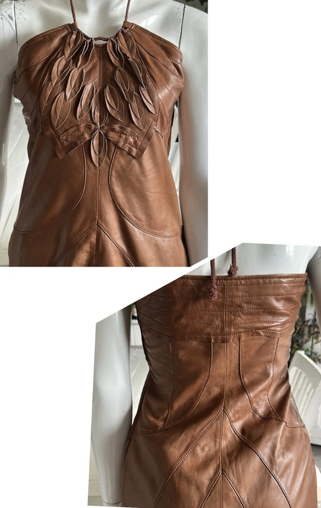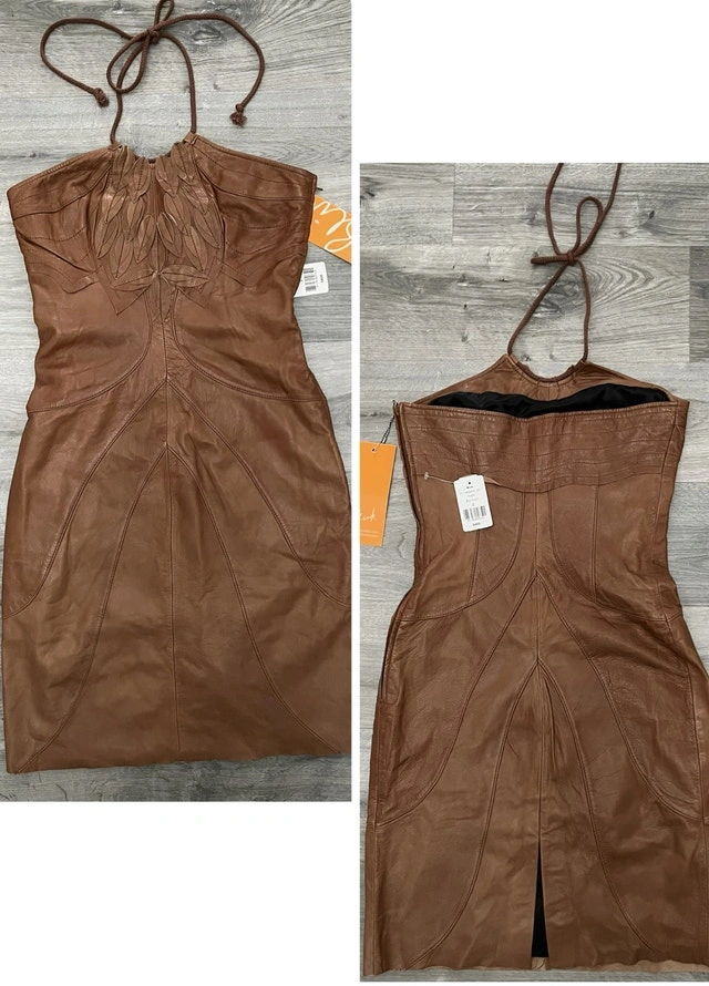 Brand new Danier halter dress with tags attached, from a smoke-free home. Size 2. Length: 31" (79 cm), Chest: 30" (76 cm). Color: Saddle/Tan. Made from 100% genuine lamb leather, it's incredibly soft and has a stunning feel. Fully lined with a straight-cut hem. Features a unique leaf design and a long zipper on the left side. Original retail price was $499 plus tax.