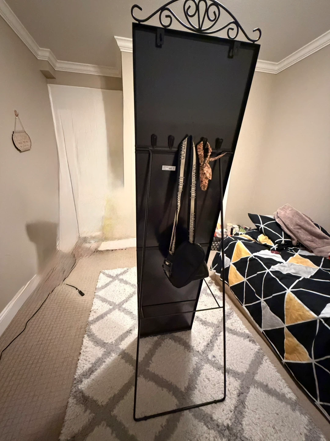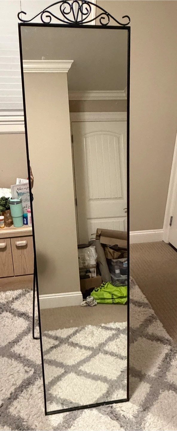 This is a tall, freestanding mirror perfect for checking your outfit. It's got an ornate scrollwork design at the top. The mirror is framed in black metal. This mirror is ideal for a bedroom or dressing area. No cracks nothing. Just got it 8-9 months ago. I just love this tall mirror but im selling it cause iim moving out. You can check the price on ikea website. My last price offered would be 40-45$