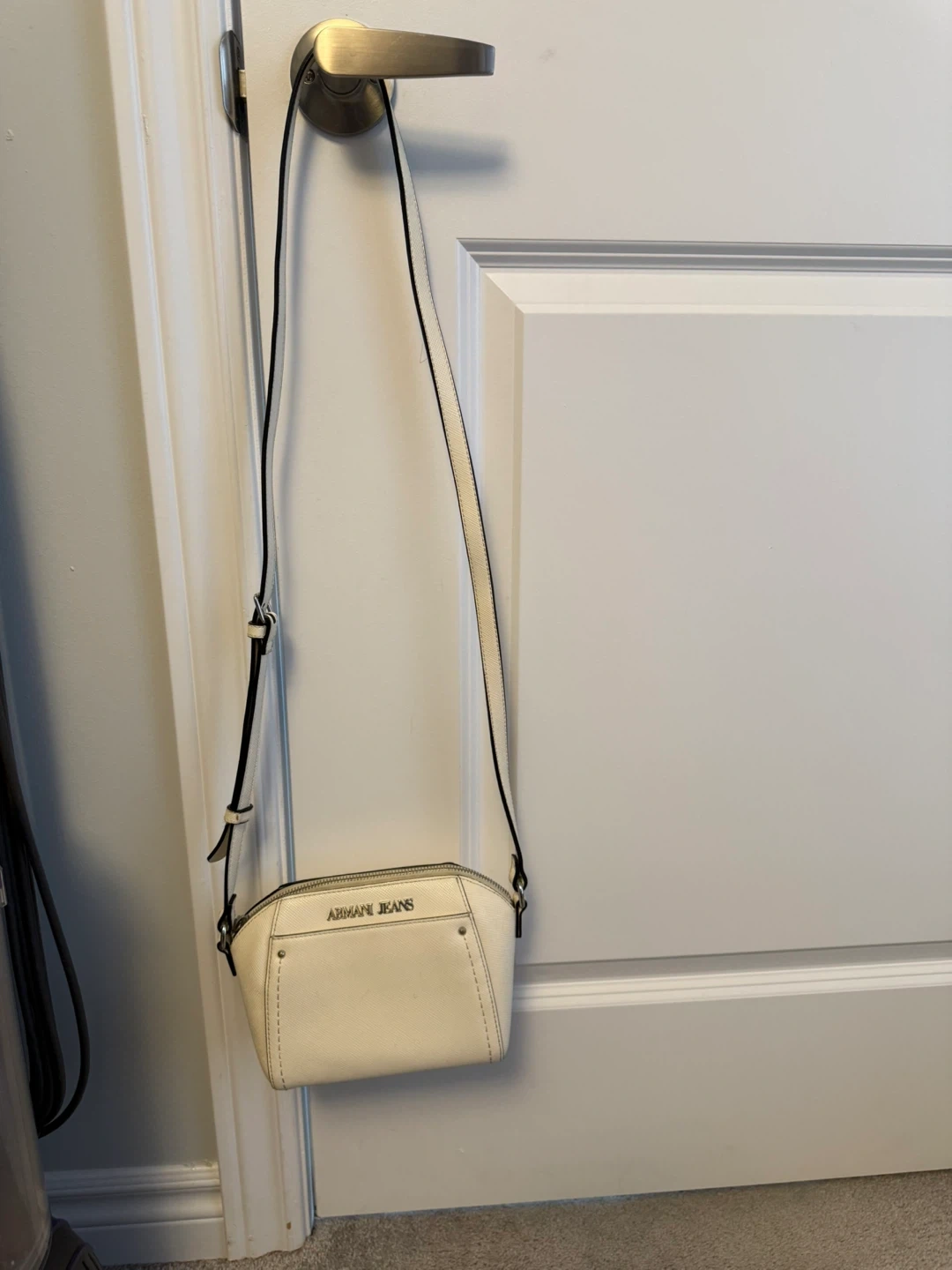 This is a white Armani Jeans crossbody bag. It has a zippered main compartment and a front pocket. The adjustable strap makes it comfortable to wear.