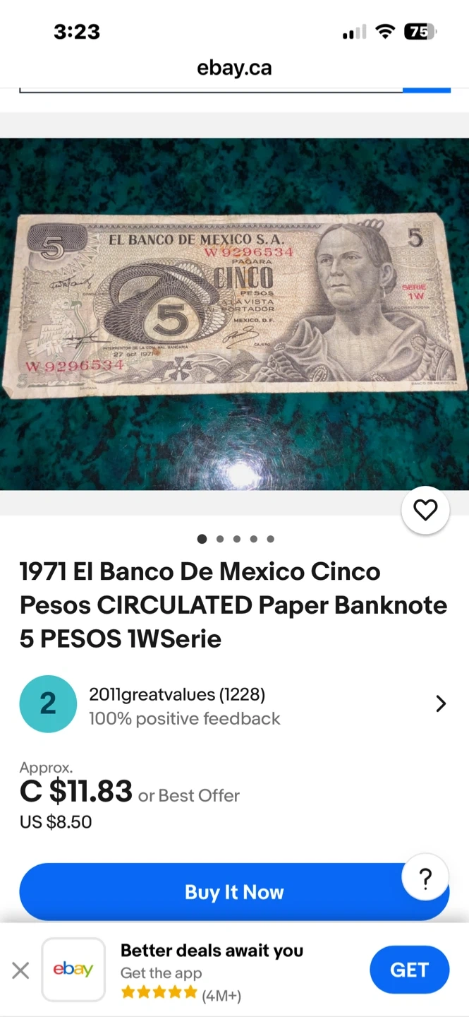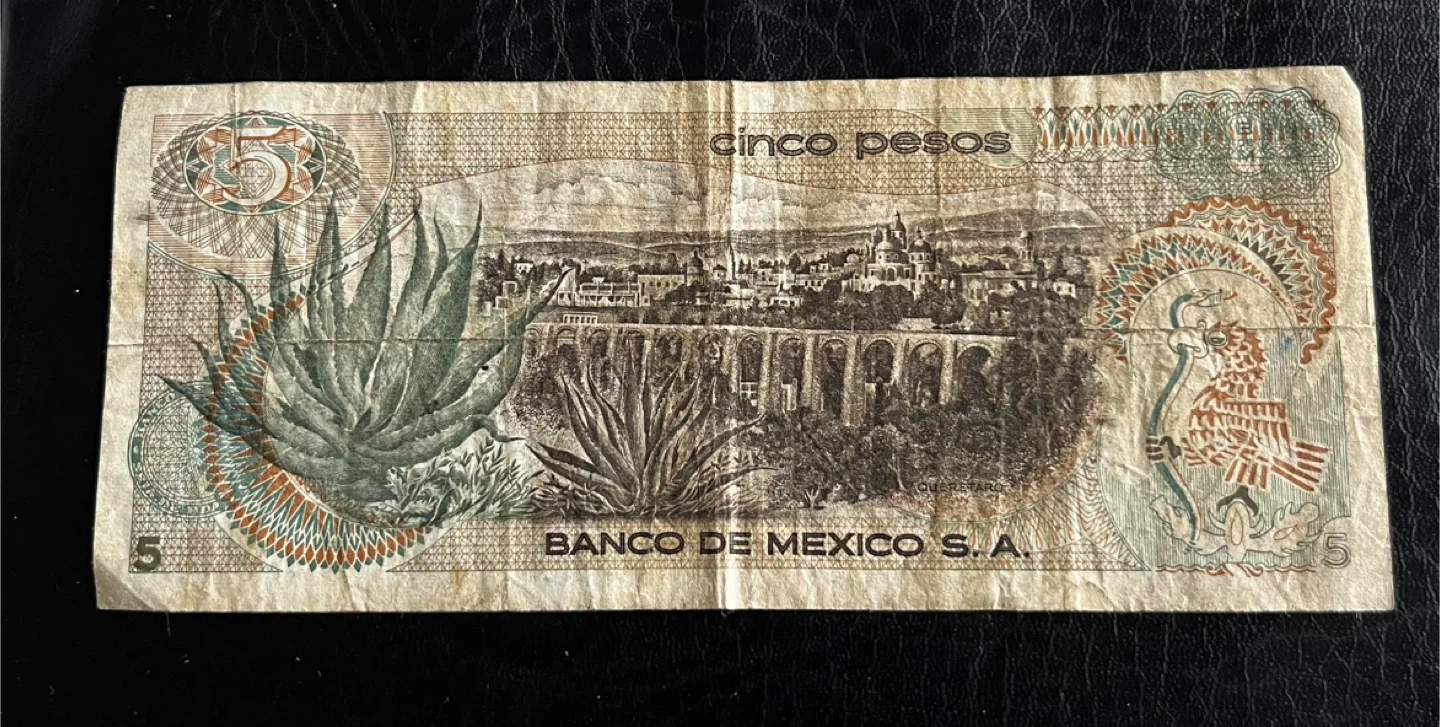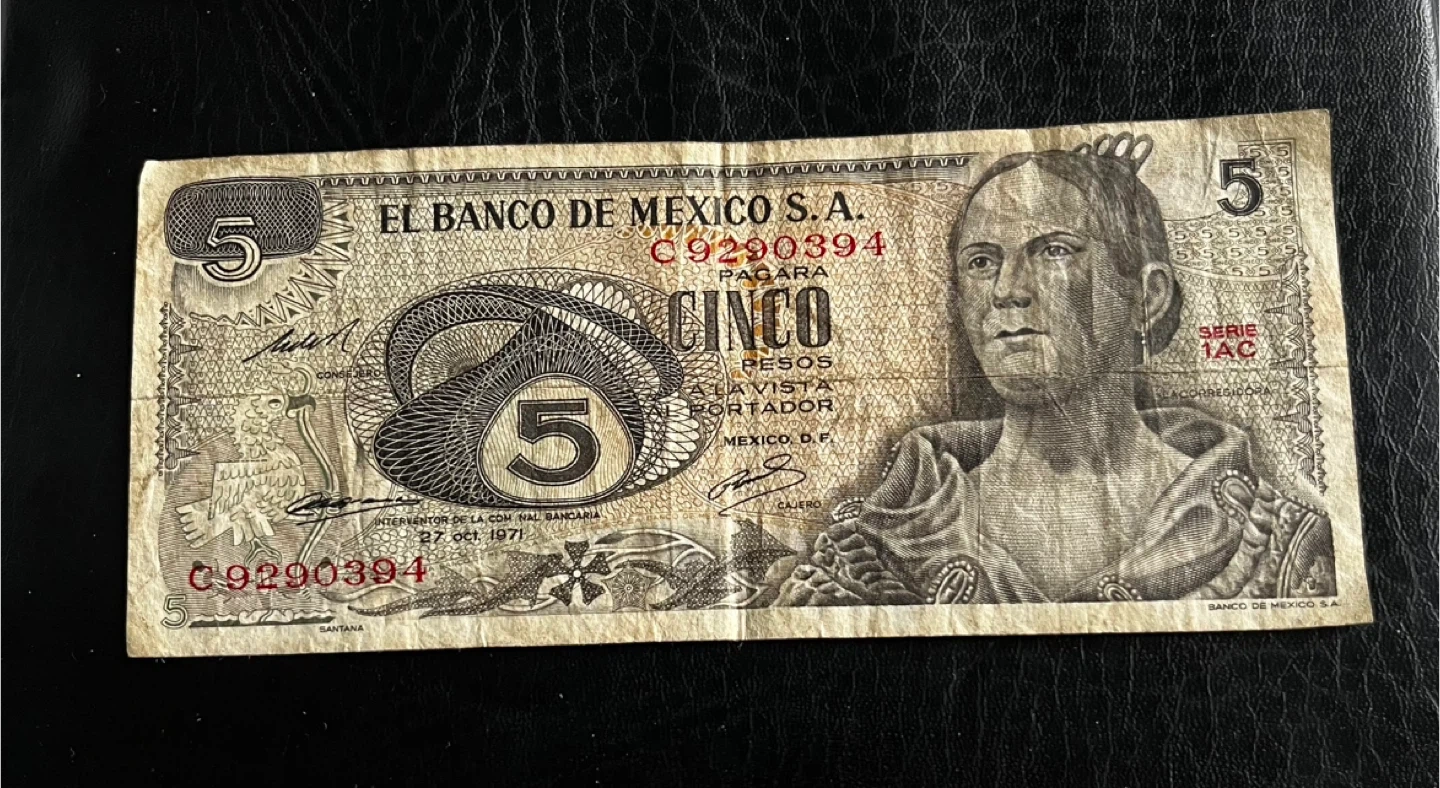 This is a 1971 El Banco De Mexico 5 Pesos circulated paper banknote. It features "Cinco Pesos" on the front and a landscape with an aqueduct on the back. It's dated 27 OCT 1971. This is a collectible item for numismatists.