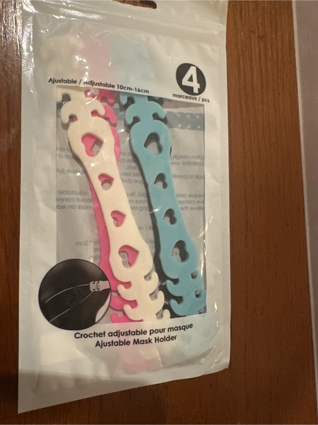 This is a pack of four adjustable mask holders. They're designed to be 10cm-16cm in length. These holders help make masks more comfortable to wear.