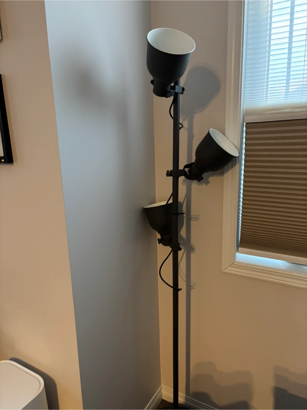 This black floor lamp has three adjustable heads. It's made of metal. Its versatile design makes it a handy light source for any room.