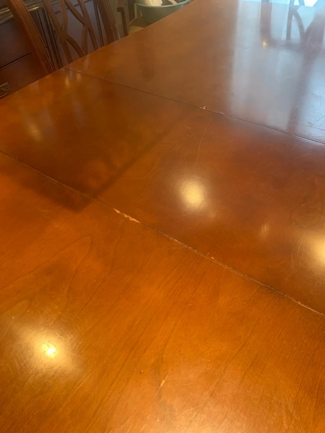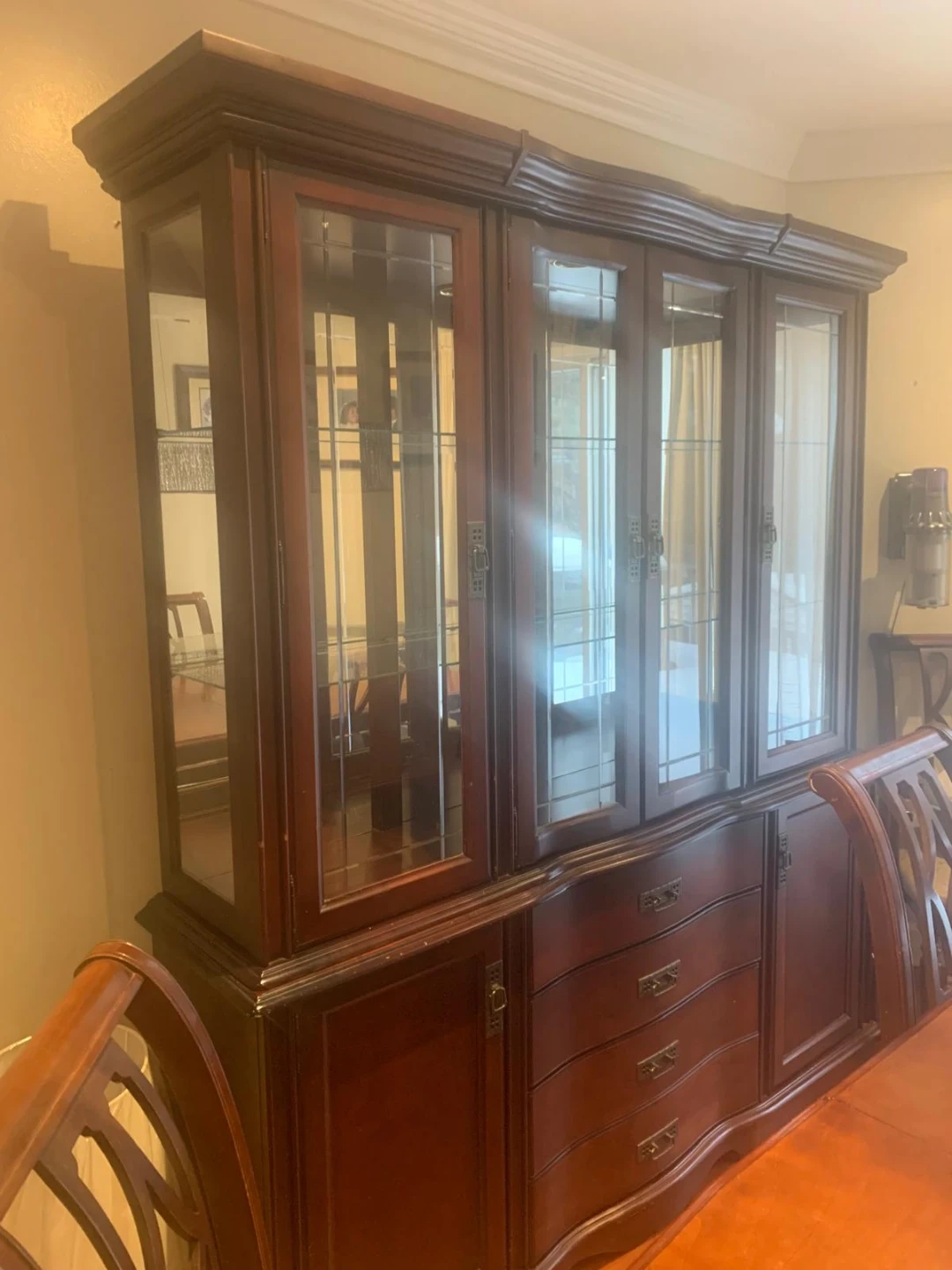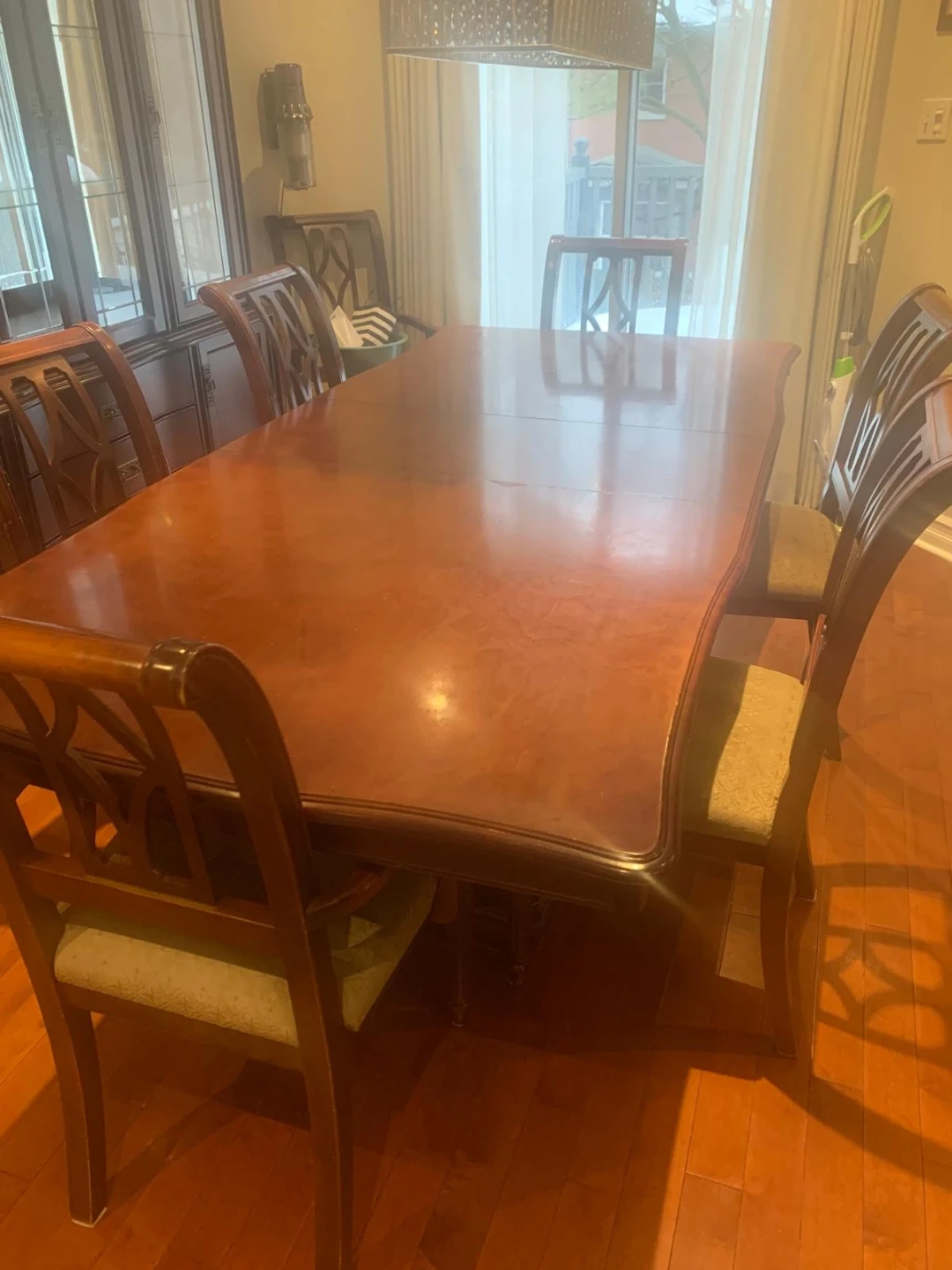 A beautiful cherry wood dining table and matching hutch set. The table has a polished finish and comes with six upholstered chairs. The hutch features glass-paned doors and drawers for storage. It's a great set for family dinners or entertaining guests!