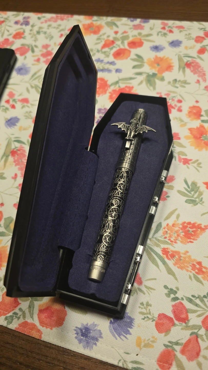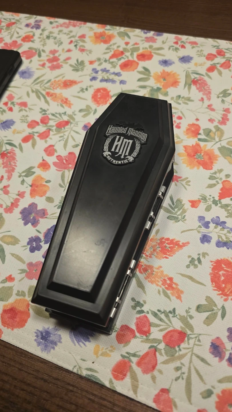 This unique pen comes in a coffin-shaped case, inspired by the Haunted Mansion. It's a decorative writing instrument with intricate scrollwork and a bat accent on top. The pen is housed in a plush, dark blue interior, perfect for display or gifting.