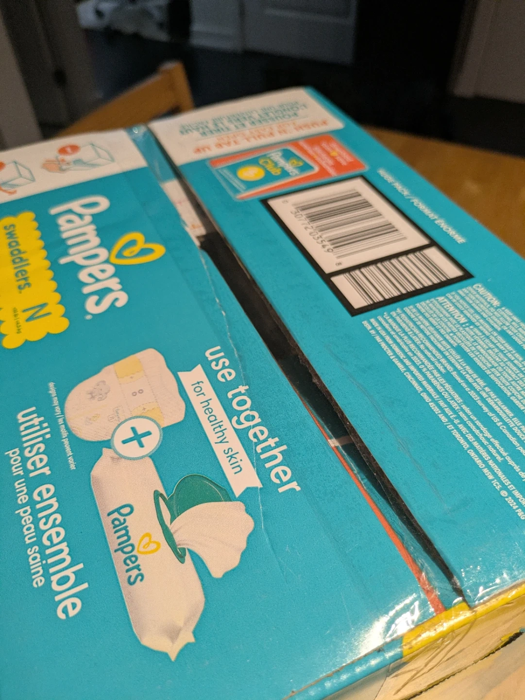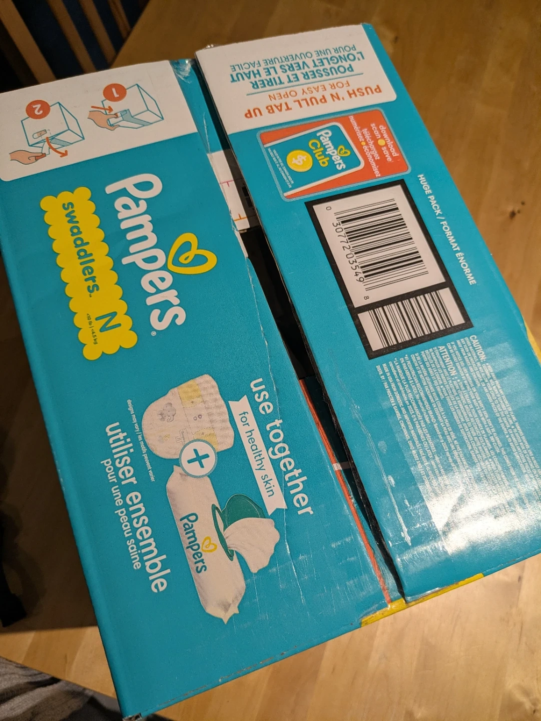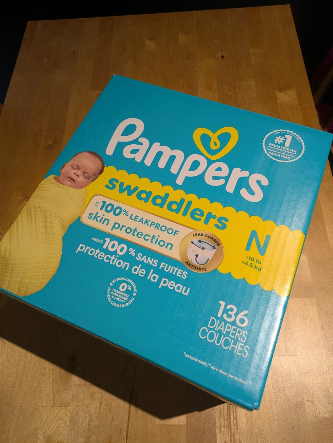 Pampers Swaddlers diapers in Size N for babies up to 10 lbs. These diapers offer 100% leakproof skin protection and are hypoallergenic. It's 136 diapers in the pack. Useful for newborns needing gentle and protective diapering. Retail price:$40