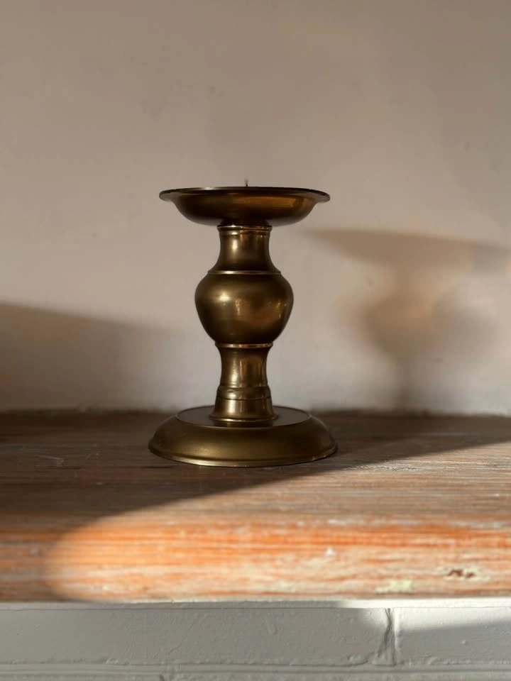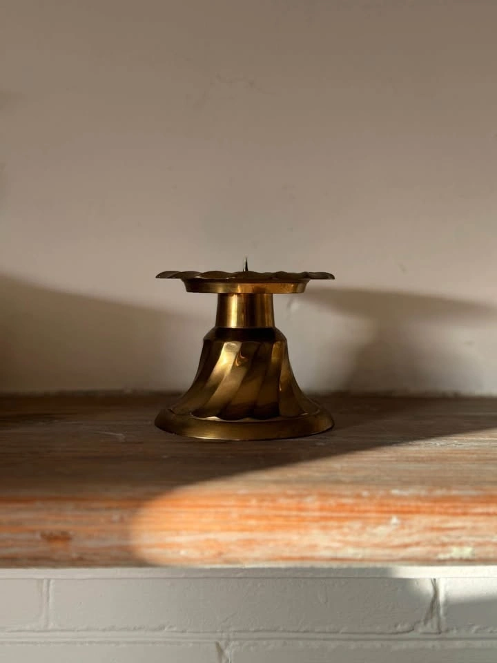 Beautiful set of vintage solid brass candleholders with warm aged patina. These are heavy, well-made pieces in three complementary styles and heights—perfect for styling a fireplace mantel, bookshelf, or dining table.