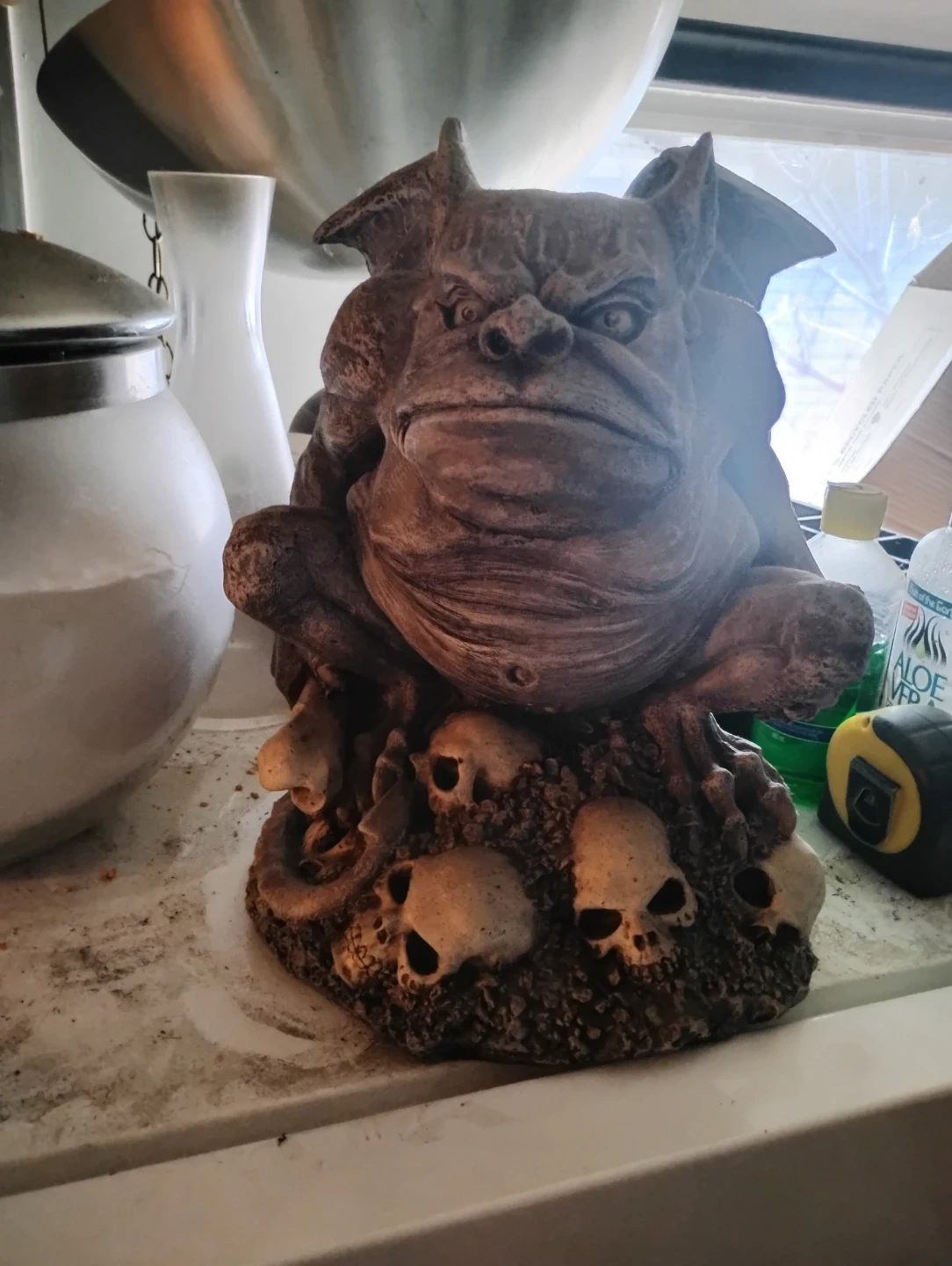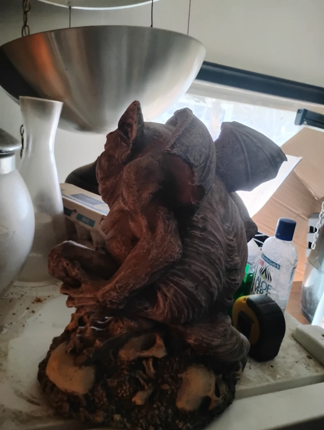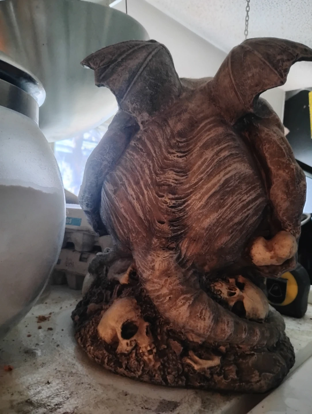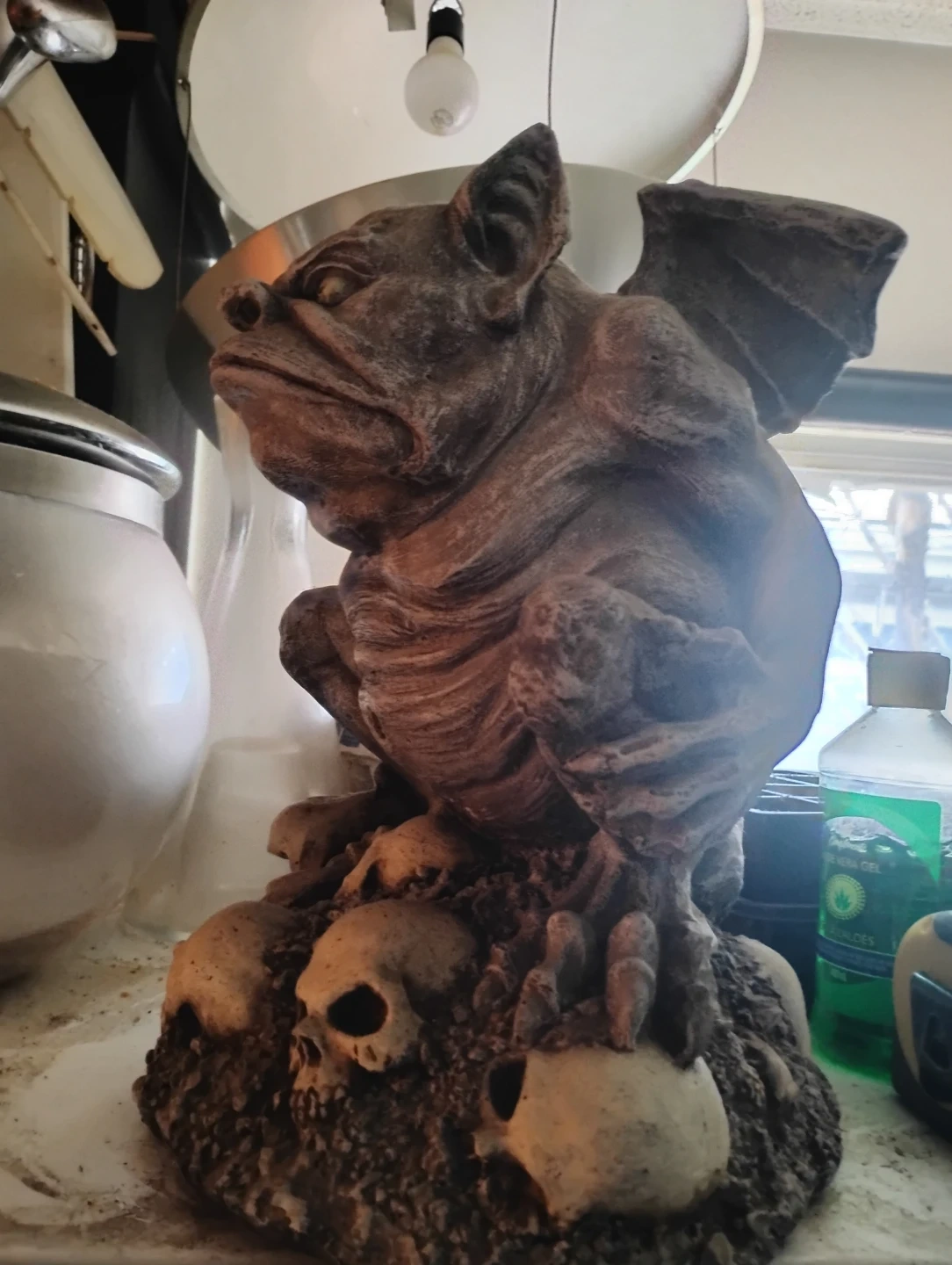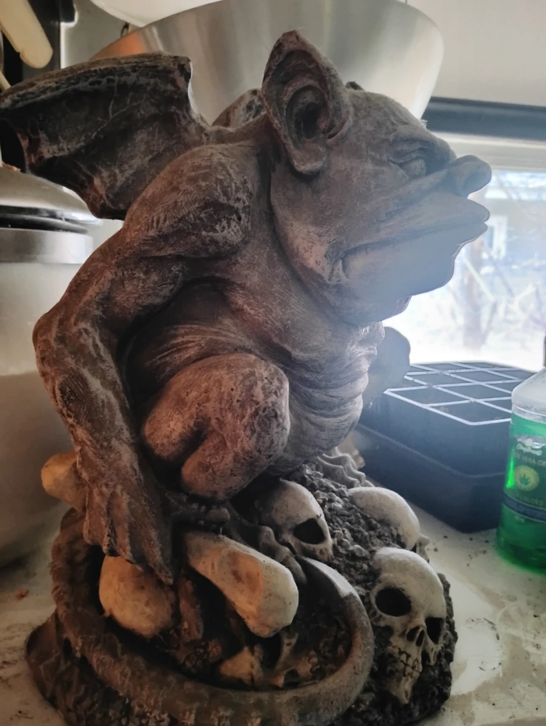 A detailed gargoyle statue with a gothic theme, featuring skulls at its base. This figurine adds a unique, spooky touch to any decor. It's made from a durable material.